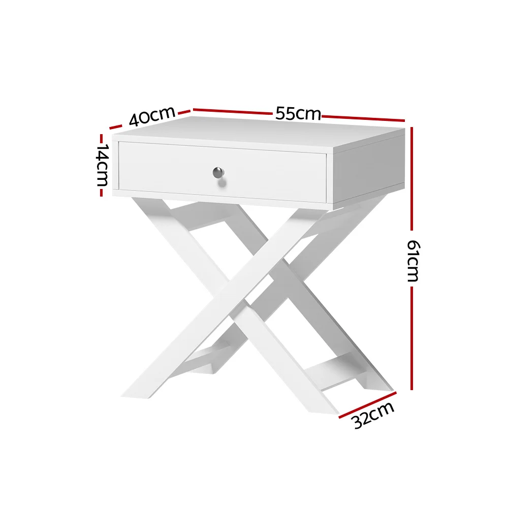 Many bedside tables look mundane and ordinary, but not our rustic retro-inspired Artiss Qara Bedside Table. Crafted from solid E1 particle board with a melamine finish, our bedside table is incredibly durable and built to last. The cross-legged design is not only uniquely stylish but provides additional support. The generous-sized storage drawer is fronted by a sleek aluminium handle and opens smoothly to ample space for your bedside essentials. The generous tabletop has a weight capacity of 20kg for your favourite books, décor or other trinkets. Of course, our bedside table need not be confined to your bedside. It also sits well next to your favourite armchair or at any end of your lounge set. Easy to assemble and even easier to maintain, the Artiss Qara Bedside Table is the perfect addition to any bedroom.