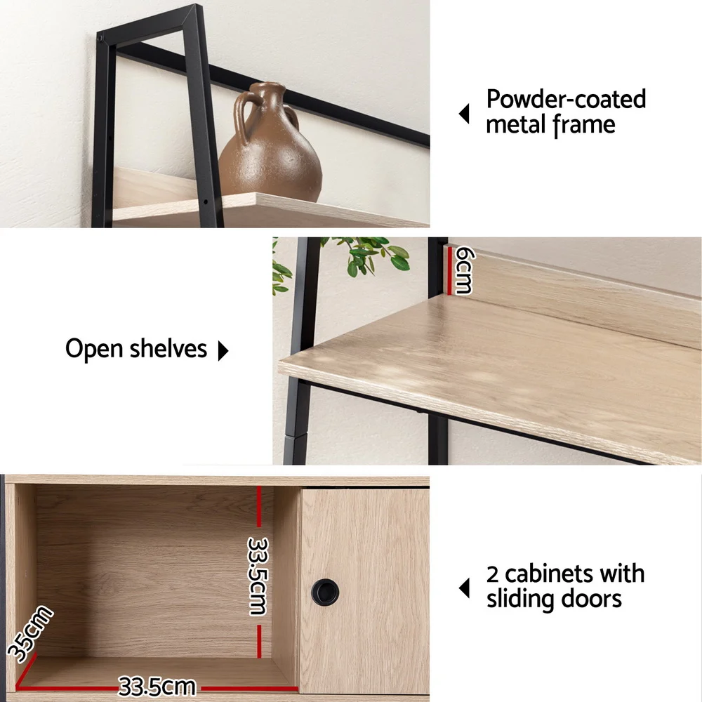 Show off your favourite home d��cor with the Artiss Mira Display Shelf. Built with a powder-coated metal frame, high-quality fixings and thick MDF board, the shelves are rust and corrosion-resistant as well as strong and durable. Each shelf uses 15mm thick board and has a 10kg weight capacity to easily hold your books, games, artwork, souvenirs and other trinkets. Two additional cabinets at the base ensure your home will be organised and clutter-free. The smooth paper veneer finish adds to the unit's style and functionality, keeping it easy to clean and maintain. Easily assembled with the included instructions, the Artiss Mira Display Shelf is the perfect addition to customise your living space.