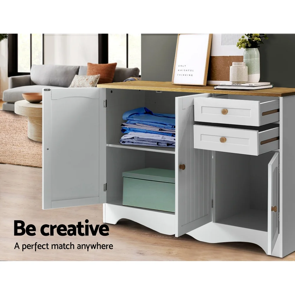 Keep your home clean and clutter-free with our Berne Sideboard from Artiss. With its vintage non-toxic paint finish, elegant detailing, and decorative features, this charming furniture is sure to grace your space. It has ample storage areas and is practical for use in the kitchen, living room, dining room, or entryway. With two spacious drawers and deep cabinets, the sideboard lets you organise your household essentials with minimum hassle. Magnetic door fittings and smooth gliding drawers also allow ease of use. Not least, the two-tone colour scheme really brings out the country vibes with this sideboard to match your preferred decor perfectly.