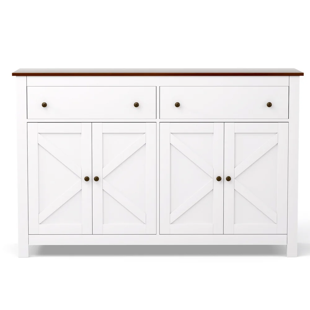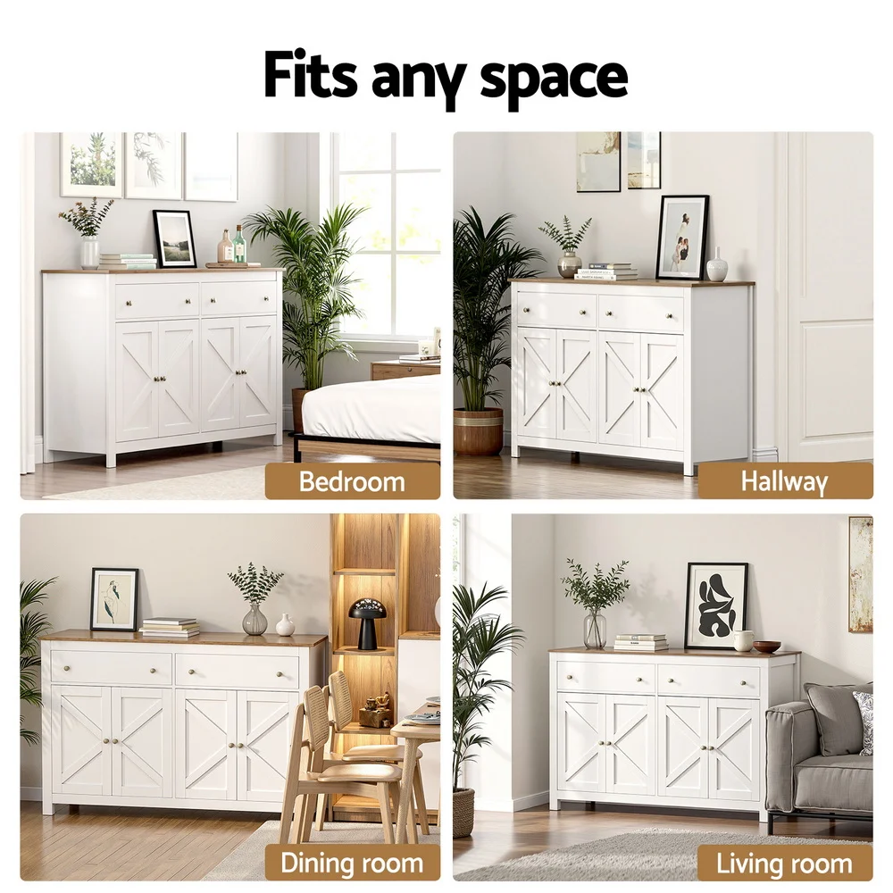 Elevate your home storage with this elegant buffet sideboard. he unique X-frame door design adds a modern aesthetic, while the two spacious cabinets and drawers provide ample room for your dining essentials, books, or decor. Featuring height-adjustable shelves, you can easily customise the space according to your requirements. Silent soft-closing door hinges ensure smooth, noise-free operation, enhancing durability. Built with a sturdy particle board frame and exquisite metal handles, this sideboard is made to last. The anti-tip kit ensures safety, making it perfect for families. Easy to assemble and fits seamlessly in dining rooms, living rooms, or kitchens. Upgrade your space today with this functional and stylish storage solution!