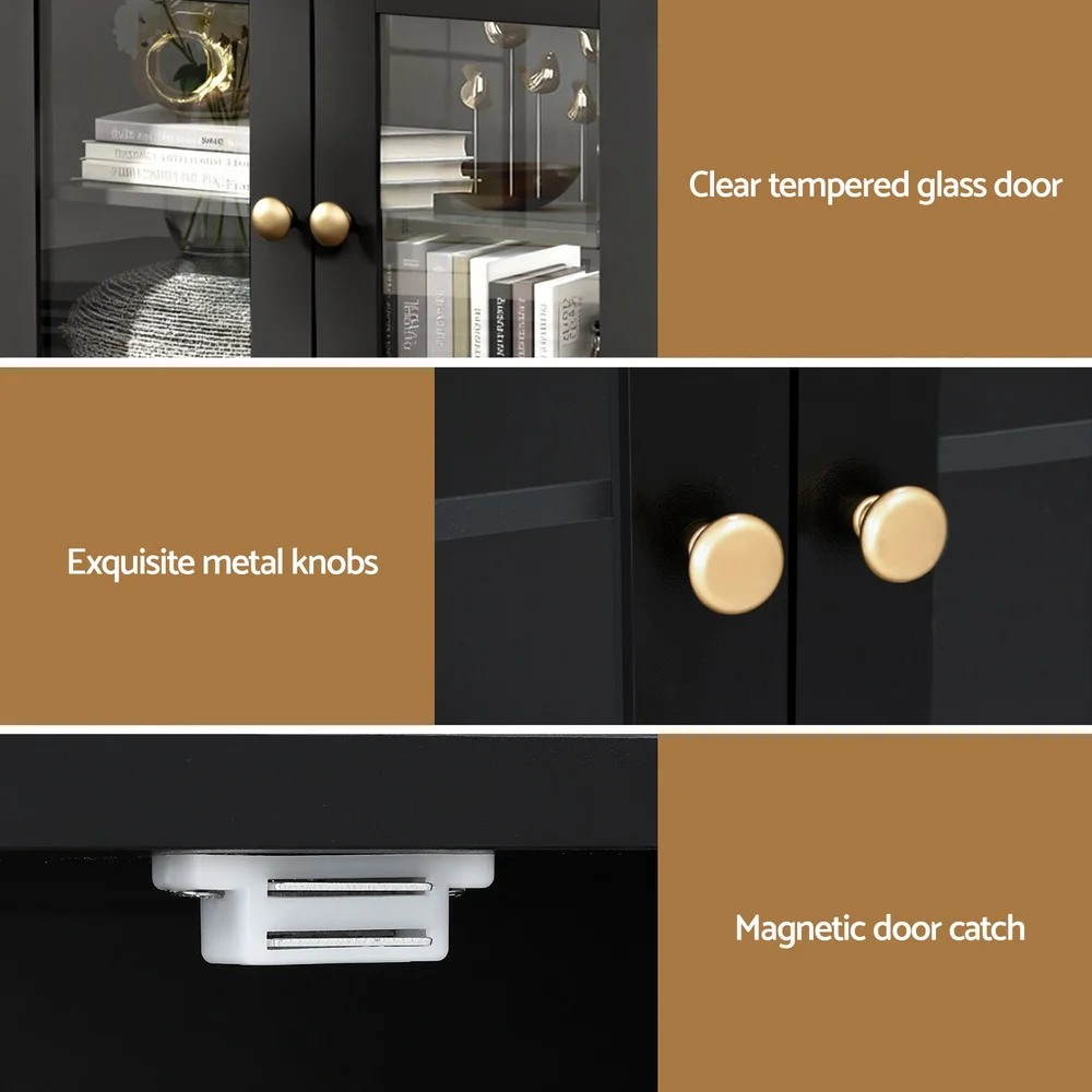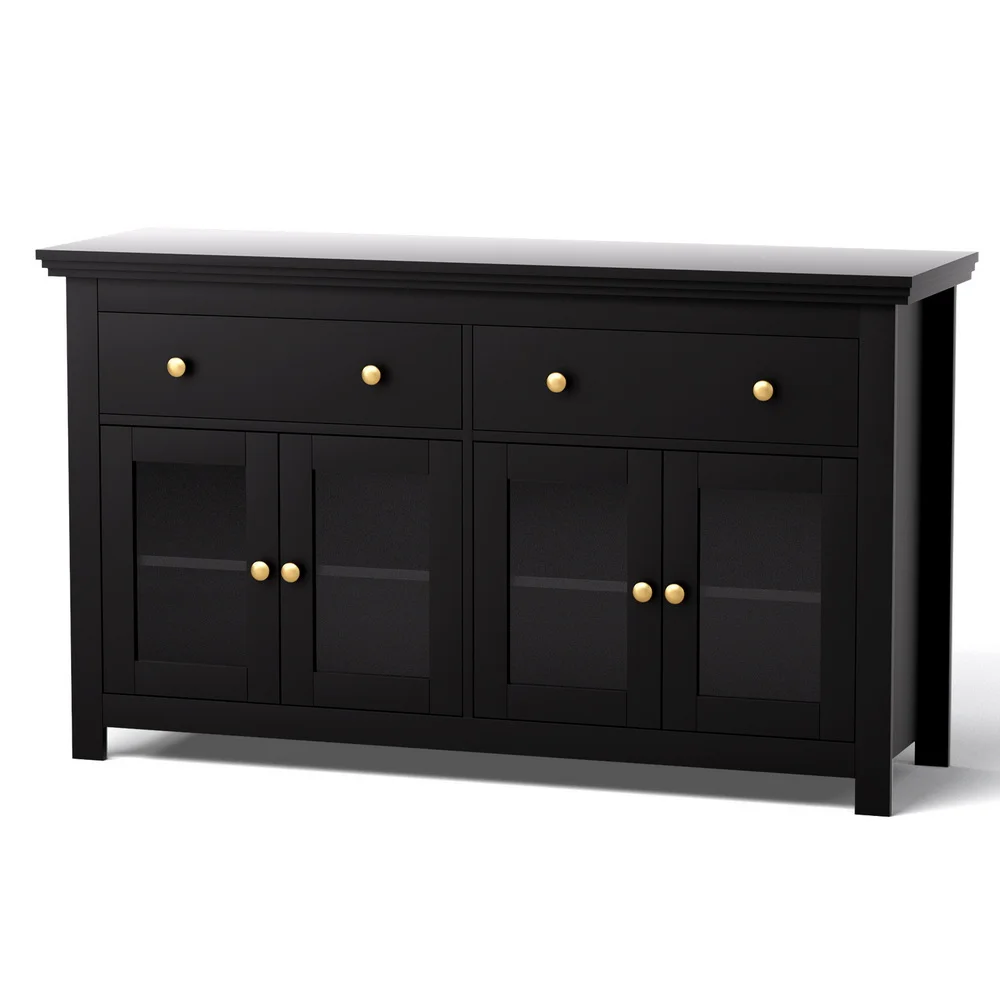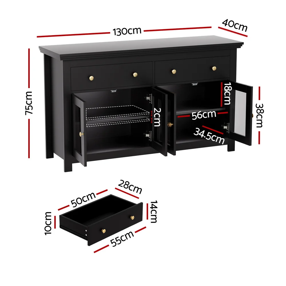 The Artiss 130cm Length Storage Sideboard is the perfect combination of style and practicality. With a spacious stepped edge tabletop, it provides a stunning platform for decor or daily use. The sideboard offers versatile storage zones, including 2 smooth drawers, 2 cabinets, and clear tempered glass doors for elegant display. Height-adjustable shelves allow you to customise the interior space to fit your needs, while the sturdy particle board frame and exquisite metal knobs ensure long-lasting durability. An anti-tip kit is included for added safety, making it the ideal choice for family homes. Easy to clean and simple to assemble, this chic sideboard will elevate any space. Transform your space—order yours today!