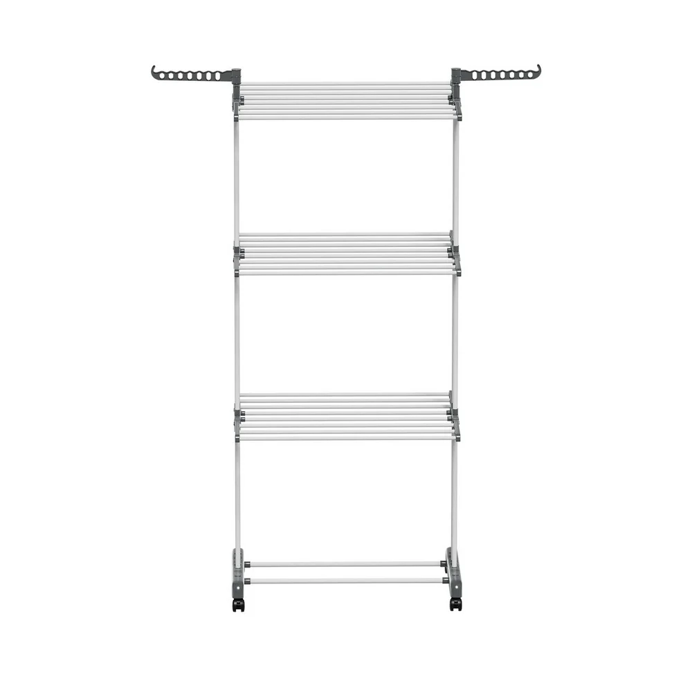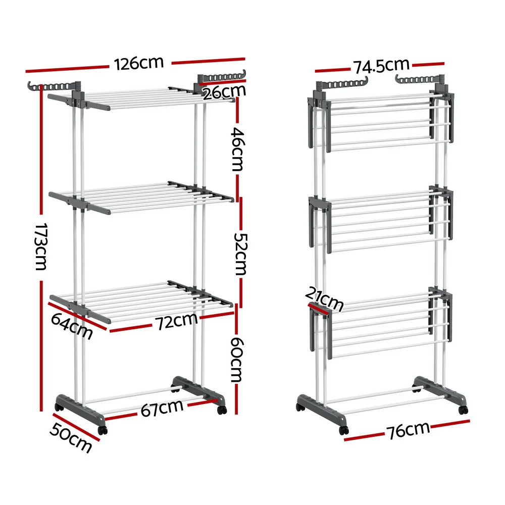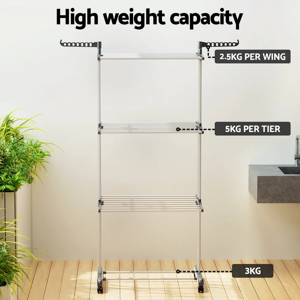 Prepare for laundry day with the heavy-duty, 3-tier Clothes Drying Rack from Artiss. The rack is constructed from sturdy powder-coated metal tubing and solid plastic and can support up to 20kg of laundry. Not only are there 3 generous tiers to hang clothes, linens and undergarments, but there are two handy side hooks that will support various hangers, and two lower bars allow for additional storage. Generous spacing between each bar allows for proper airflow, helping your clothes dry fast. The entire unit is incredibly lightweight and portable, and four convenient lockable wheels can help you move around and keep in one place as required. Once laundry day is over, simply fold the unit and store it away until needed. For fast and convenient clothes drying, look no further than the Artiss Clothes Drying Rack.