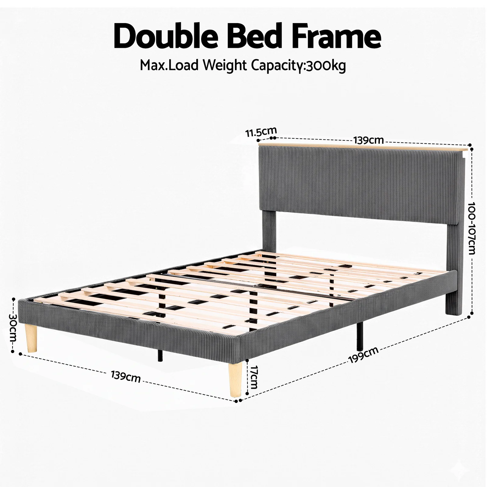 Headboard full size: 139W x 43H x 11.5T/cm; height adjustable