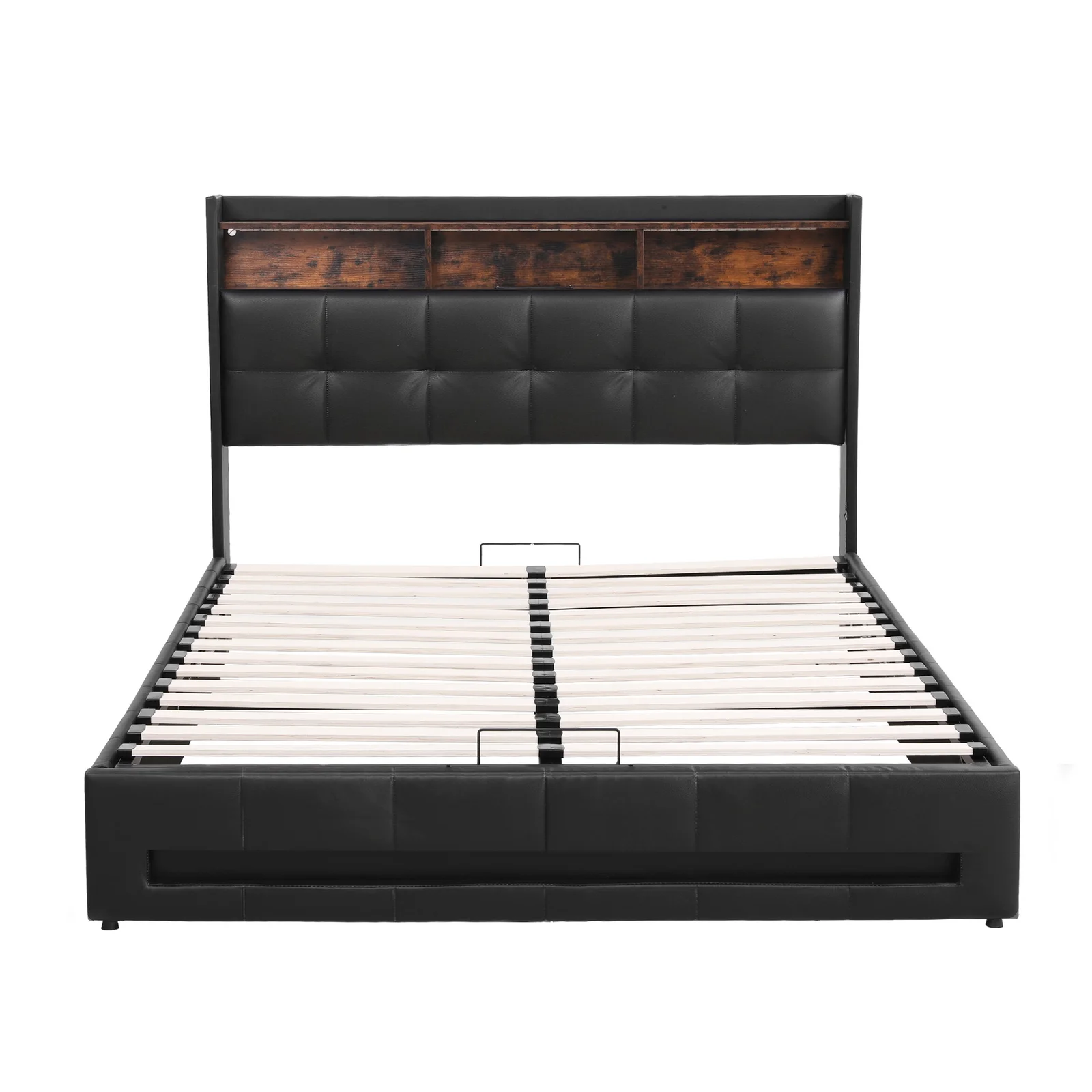 Upgrade your bedroom with this modern double bed frame. It features a convenient gas lift mechanism for ample hidden storage, perfect for seasonal items. The integrated charging station with USB and Type-C ports keeps devices powered. Customisable LED lights on the headboard and footboard set the mood. Upholstered in soft PU leather with a supportive headboard, its robust metal frame and slats provide heavy duty support designed for quiet operation. Easy assembly completes this functional queen size centrepiece.