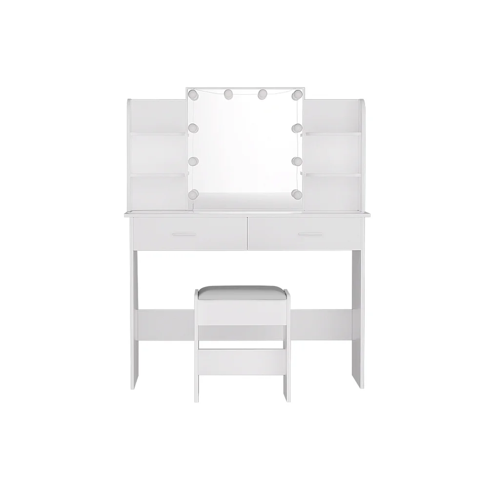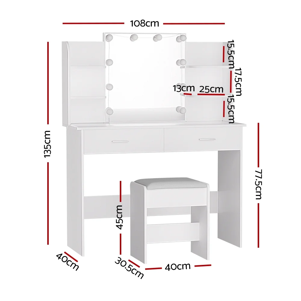 Feel like a star straight out of Hollywood with the Artiss Dulcea Dressing Table. Packed with generous storage and other convenient features, your new beauty routine will be a breeze. Made from quality MDF particleboard with a melamine finish, the table is built to last. The Hollywood-style makeup mirror is surrounded by bright LED bulbs for the perfect illumination. Choose from warm, neutral and daylight white light so you can always look stage-ready. The vanity features open shelves that you can use to display trinkets or beauty products. Two generous storage drawers with silver handles open smoothly on anti-rust runners, giving you instant access to your beauty essentials. A foam-padded PU leather stool allows you to sit comfortably while applying make-up or skincare and can be neatly tucked away when not in use. Easy to install and even easier to maintain, you'll love getting ready for the day in front of your new Artiss Dulcea Dressing Table.