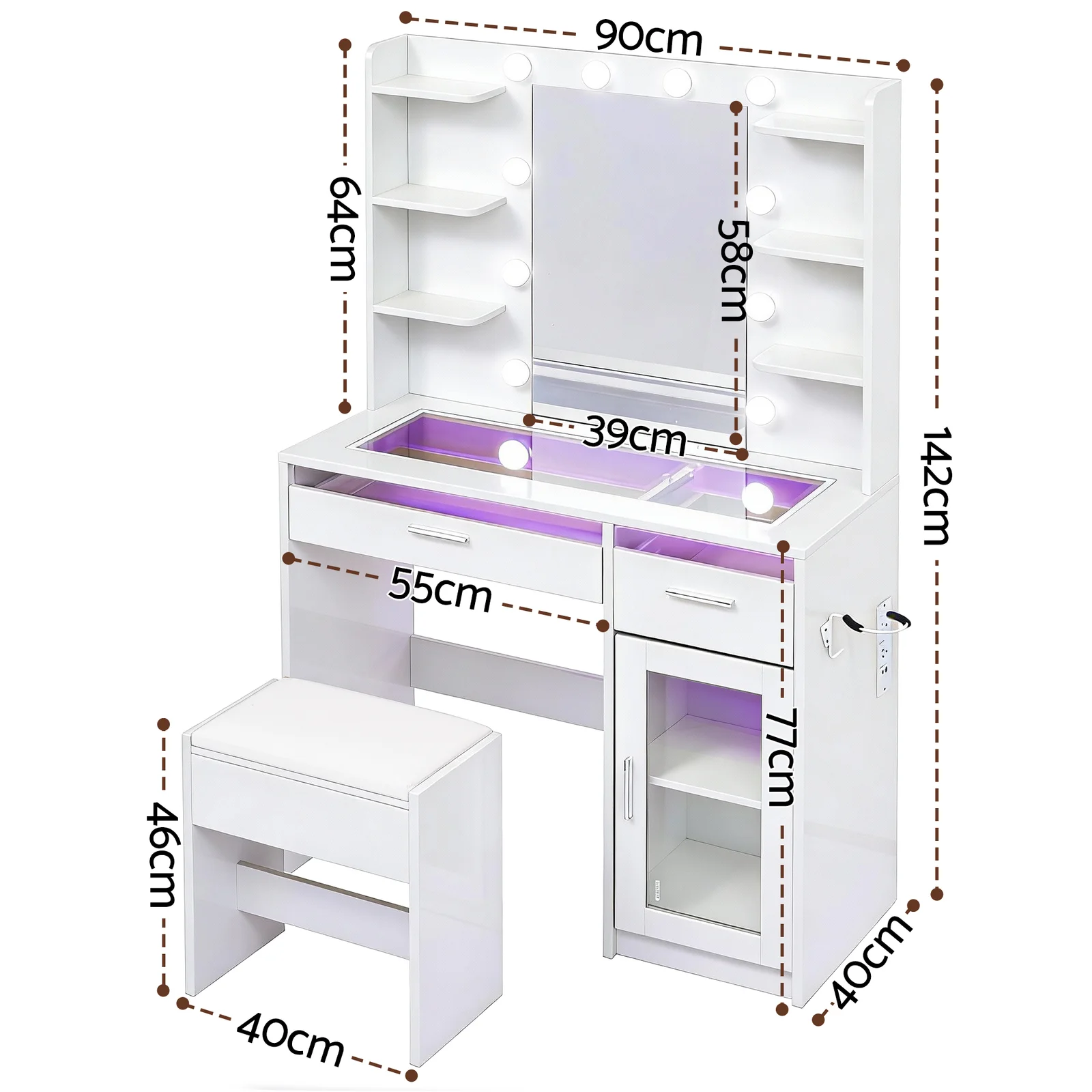 Discover the perfect balance of beauty and function with the Artiss Dressing Table. This modern Vanity Desk features a Hollywood-style makeup mirror surrounded by LED bulbs with three colour settings and storage drawers with adjustable RGB lighting, giving you full control of your beauty ambience.