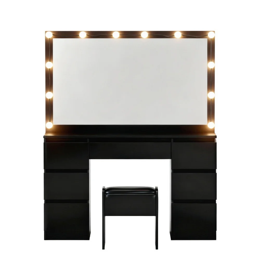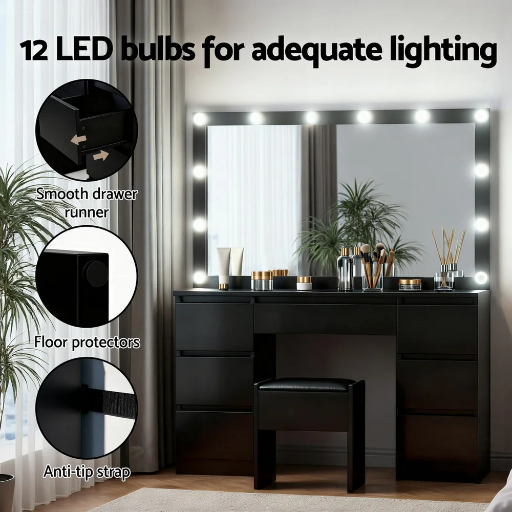 Elevate your beauty regimen with the Artiss LED Dressing Table, featuring salon-grade illumination that adapts to any lighting condition. The adjustable 3 LED colour lights ensures true-color makeup application, complemented by a large mirror that provides a clear reflection for grooming and makeup application. Thoughtful details abound - from the anti-tip strap to the floor protectors. 7 spacious drawers enable categorized storage with dustproof privacy. Complete with a foam-padded PU leather stool, this contemporary set combines professional functionality with minimalist aesthetics, making it the perfect centerpiece for modern bedrooms or dressing areas.