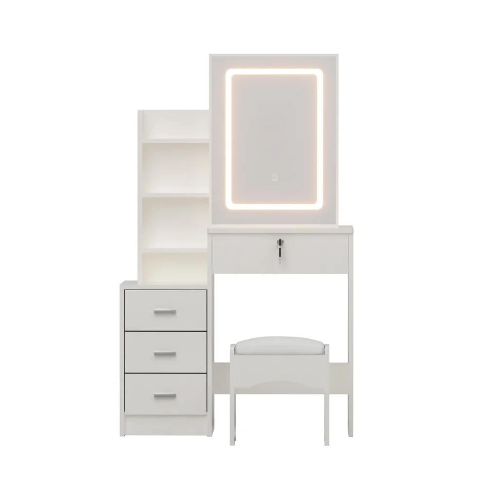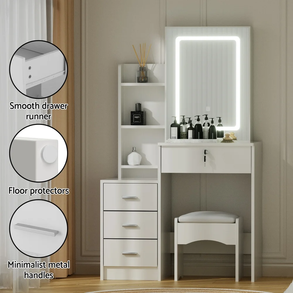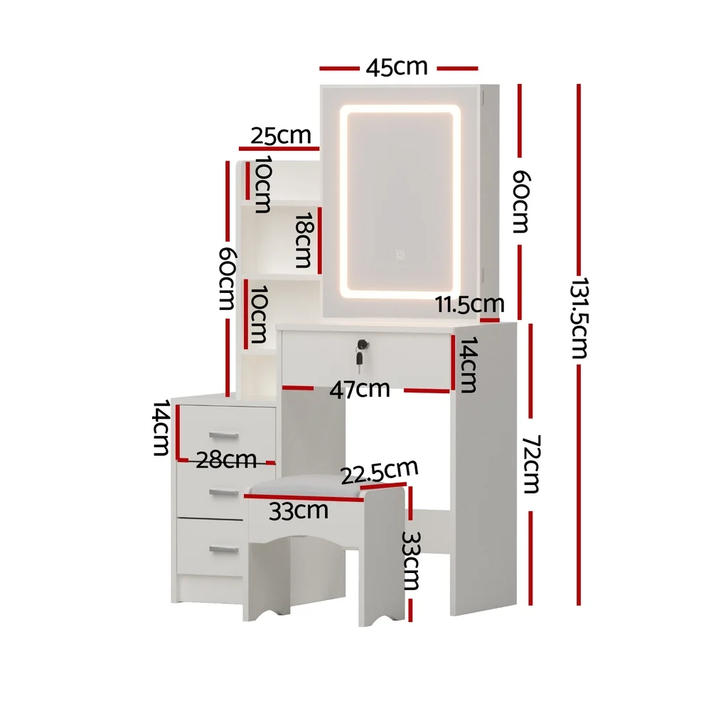 The Artiss LED Dressing Table is the ultimate blend of style and functionality. Featuring a sliding mirror door with hidden storage and 3 adjustable LED lighting options, this vanity table ensures perfect lighting for makeup application. Its 4 spacious drawers, including a lockable one, offer ample space to keep your beauty essentials organised. The foam-padded stool adds comfort, while the durable, easy-to-clean design ensures longevity. Ideal for bedrooms, apartments, or professional use, this modern vanity is a must-have for beauty enthusiasts.