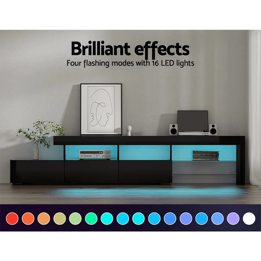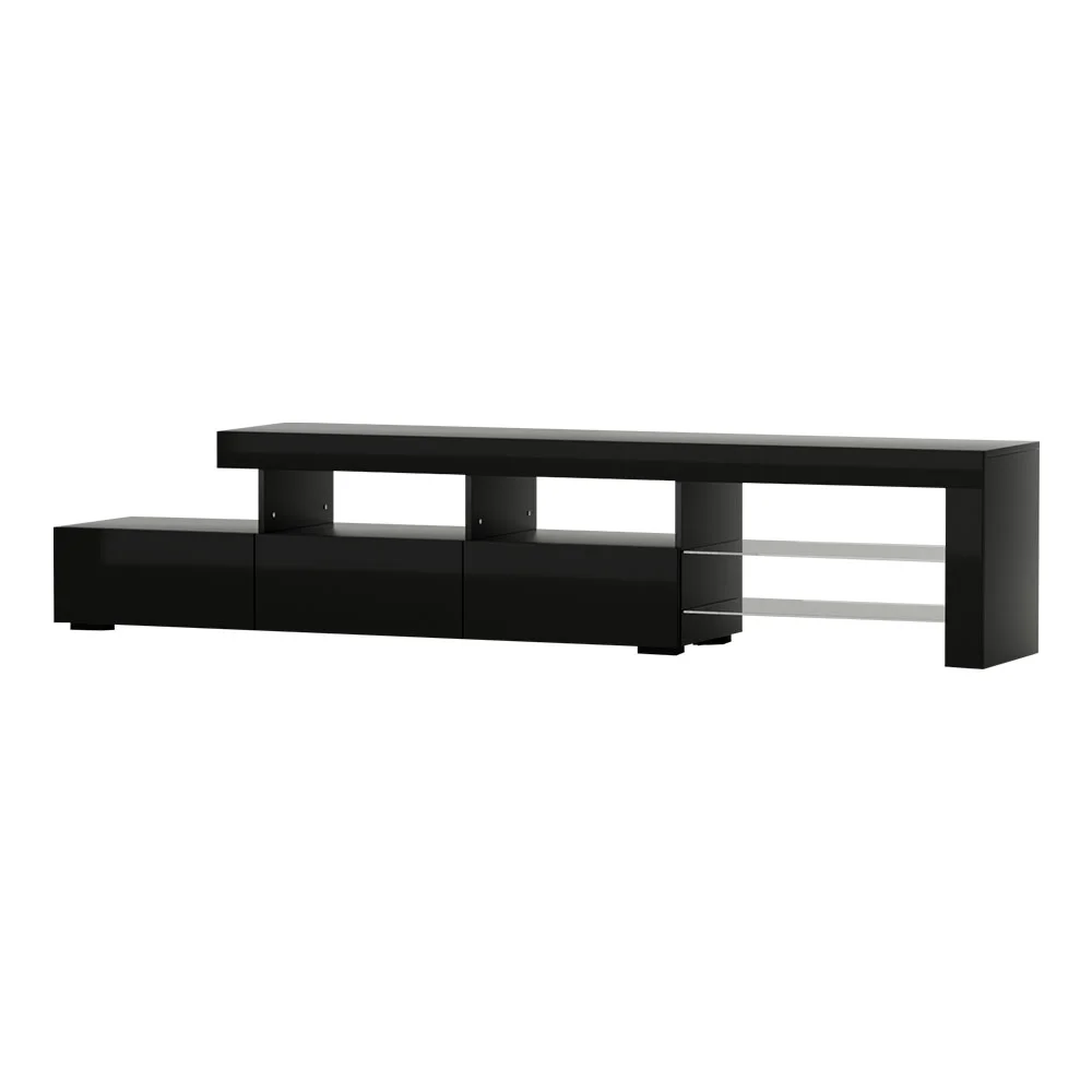 Want to add a WOW-effect to your living room? Our Artiss LED entertainment unit won't disappoint you. Boasting a unique combination of functionality and creativity, this entertainment unit is designed to enhance your living space and create a pleasant ambience. The entertainment unit features built-in RGB LED lighting that you can customise into 16 different colours and four flashing modes with a touch of a button. It will perfectly complement your modern home decor and enable you to achieve a one-of-a-kind look. Having been constructed from 15mm thick particle board with UV high gloss on the front and melamine finish, this piece of furniture is quite sturdy and will withstand the test of time. It has spacious drawers with smooth metal runners for hassle-free operation and two tempered glass shelves to store all your entertainment paraphernalia. Bring this uniquely designed entertainment unit for your home today.