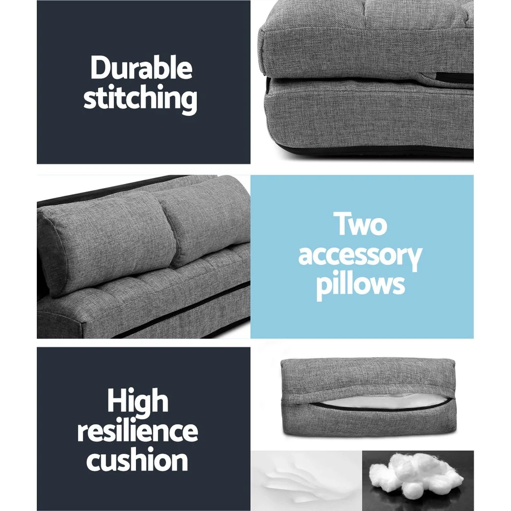 Get comfortable with the Artiss Lounge Sofa Bed for all your leisure activities. With five adjustable angle and three locking positions , the lounge sofa bed lets you sit and rest in your preferred position with absolute ease. Read a book watch TV and just chilling out, the lounge sofa bed is your definite go-to every time as a sofa, laid-back lounge or mattress. Made of heavy-duty steel and upholstered in a skin-soft faux linen fabric, the lounge sofa bed is generously padded with a high resilience foam that is durable and lasting. Not least, the lounge sofa bed can be separated into four pieces for easy storage. The zipped covers are also removal for hassle-free cleaning.