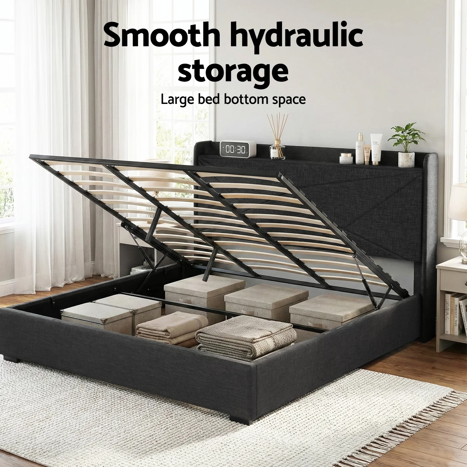 KING GAS LIFTED UPHOLSTERED BED FRAME with Charging station