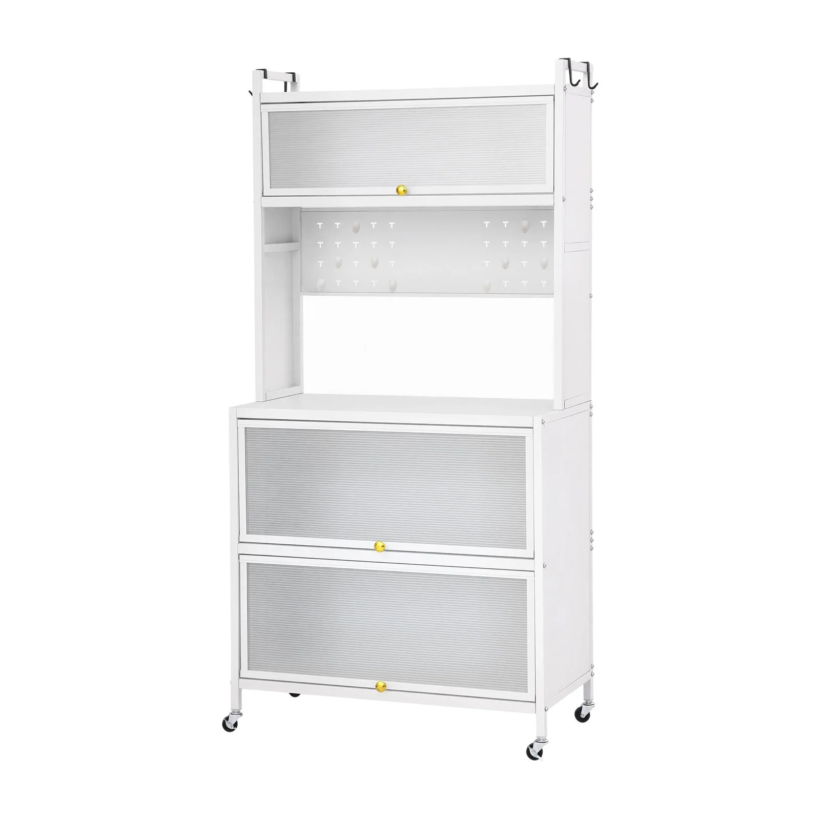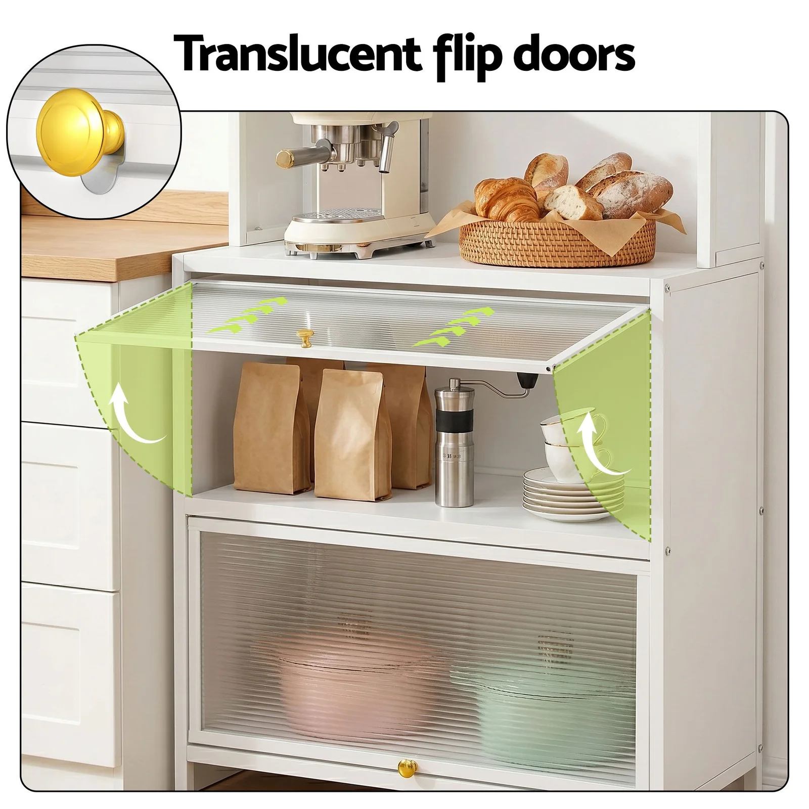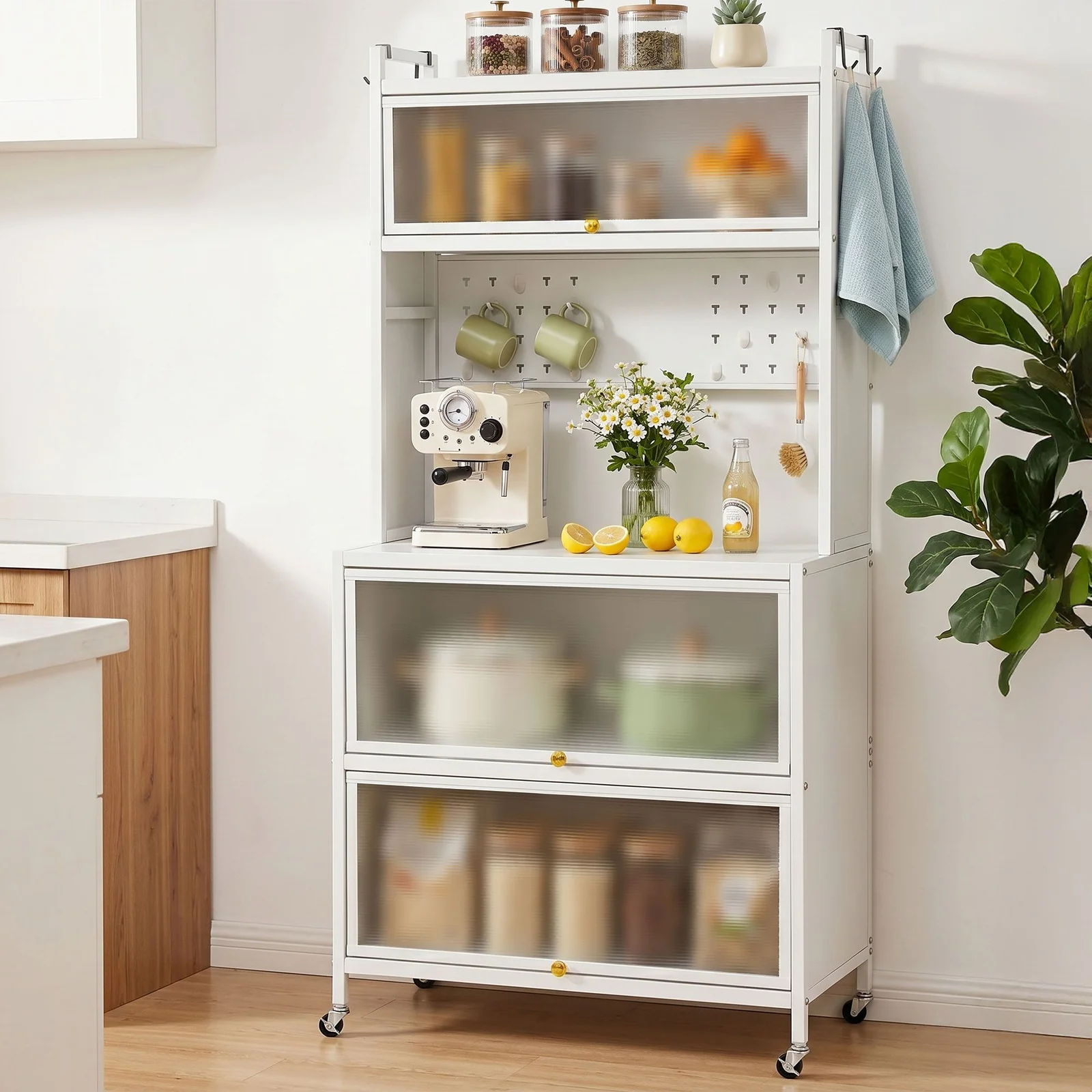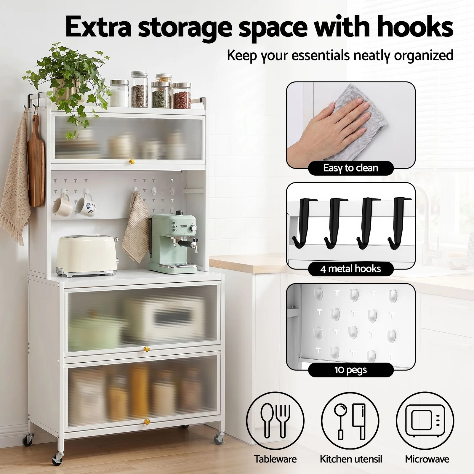 Store your spices and jars safely on the top shelf (complete with anti-falling guardrails), house your dishes in the upper and lower compartments behind dust-proof translucent flip doors, and utilize the built-in pegboard and side hooks to keep your most-used utensils right at arm's reach. The spacious main countertop alone safely holds up to 75kg. It is the perfect home for your microwave, toaster oven, or espresso machine.