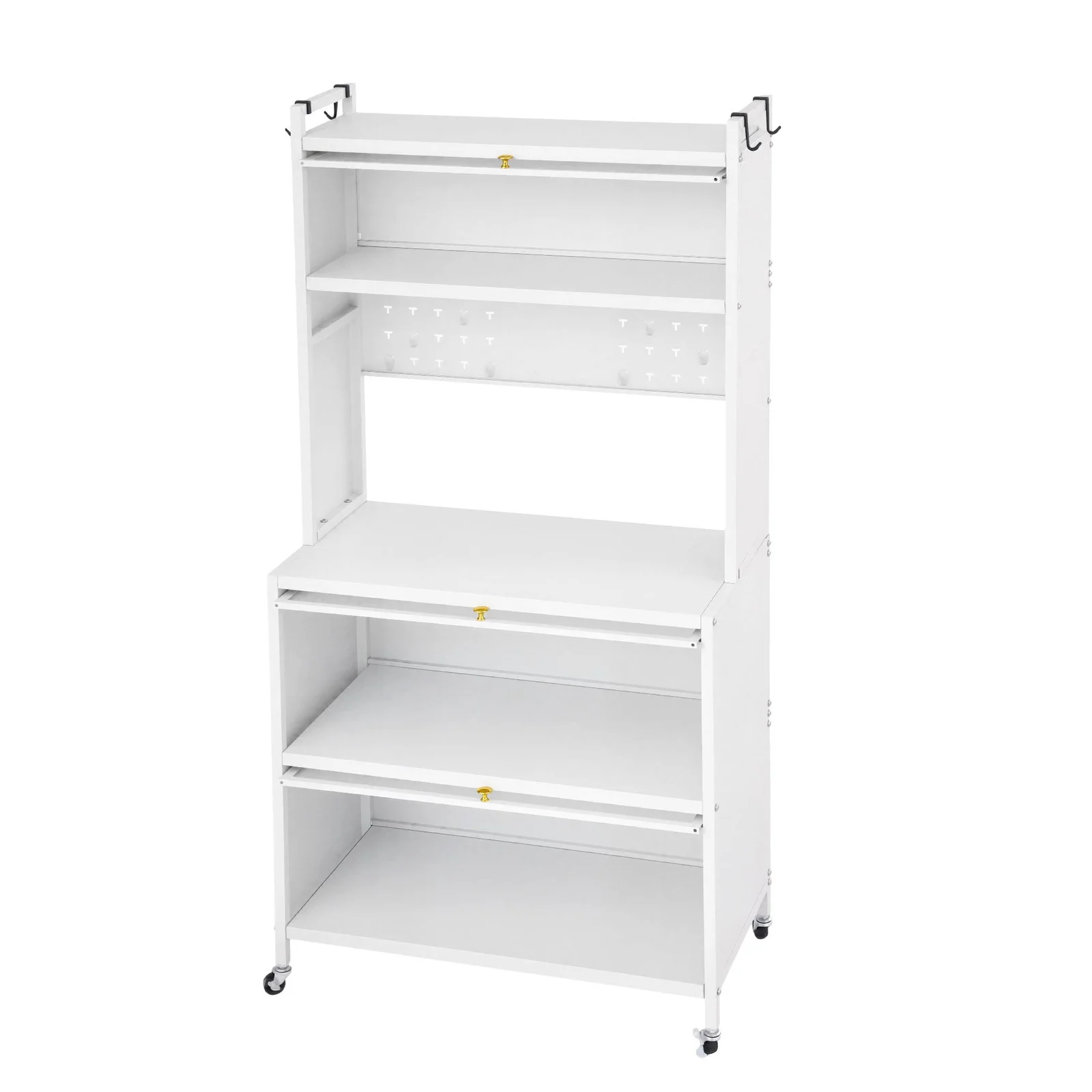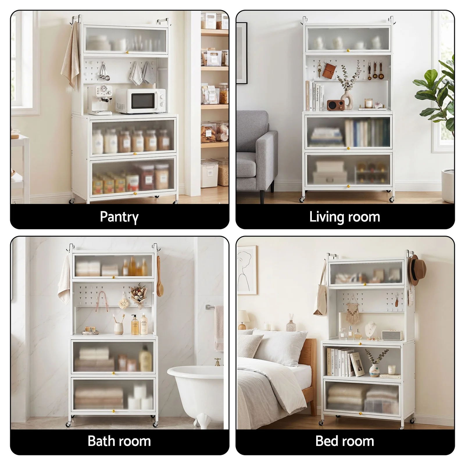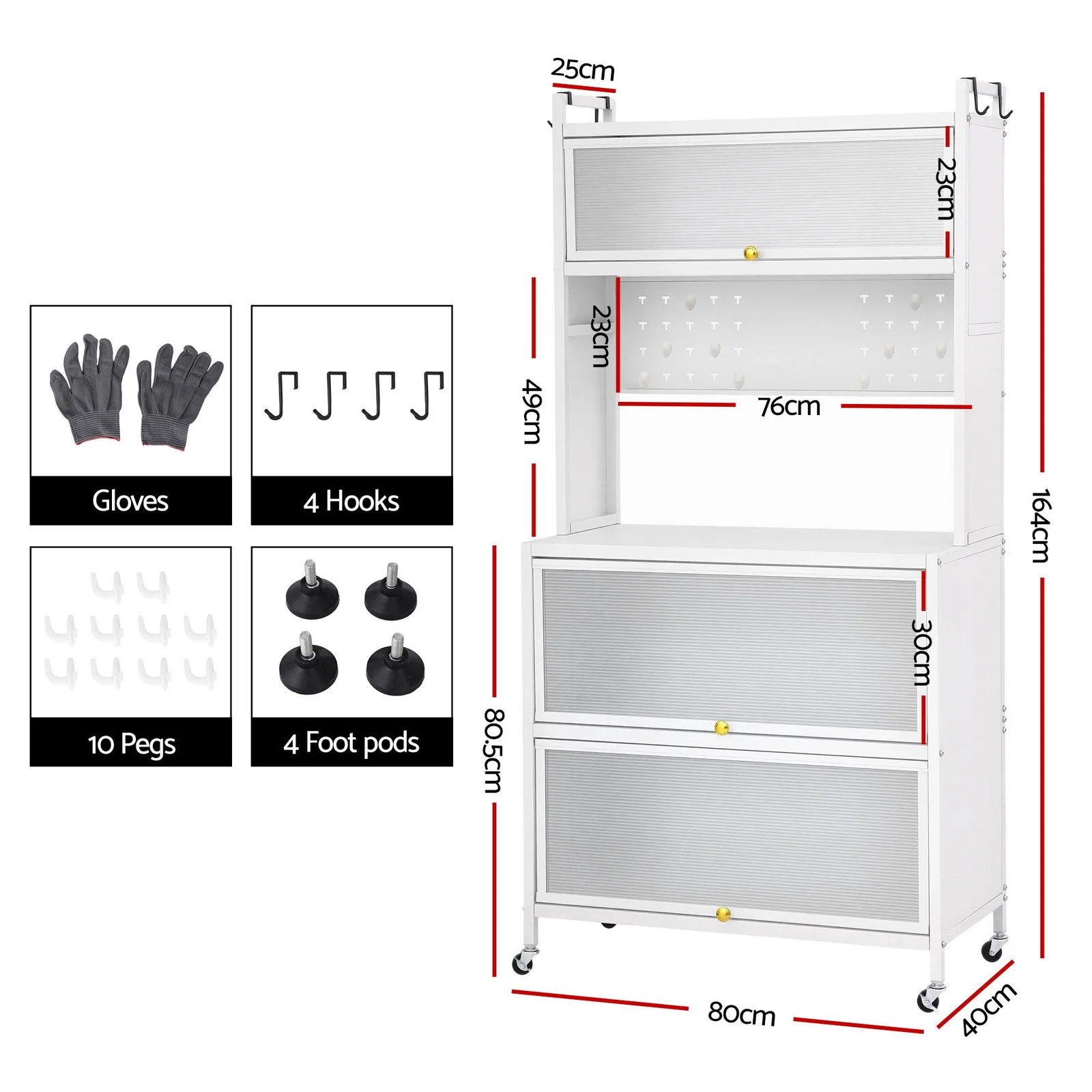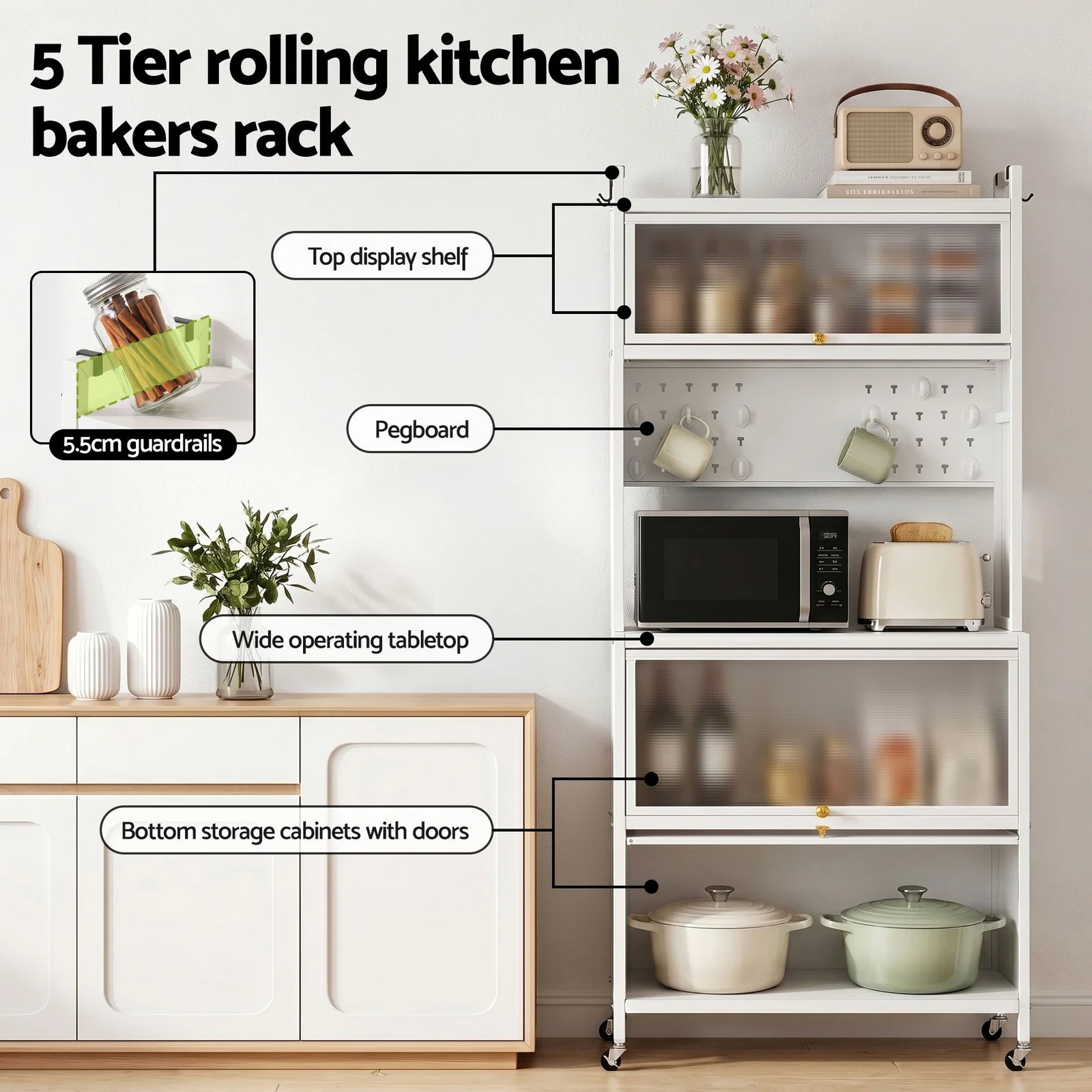 Store your spices and jars safely on the top shelf (complete with anti-falling guardrails), house your dishes in the upper and lower compartments behind dust-proof translucent flip doors, and utilize the built-in pegboard and side hooks to keep your most-used utensils right at arm's reach. The spacious main countertop alone safely holds up to 75kg. It is the perfect home for your microwave, toaster oven, or espresso machine.