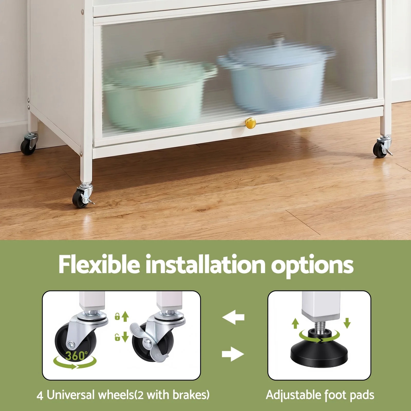 Whether you want a stationary coffee bar in the dining room or a rolling utility cart that moves from the kitchen to the living room, we've got you covered. The package includes both adjustable leveling foot pads and smooth-rolling universal casters, giving you total control over how you use your new cabinet.