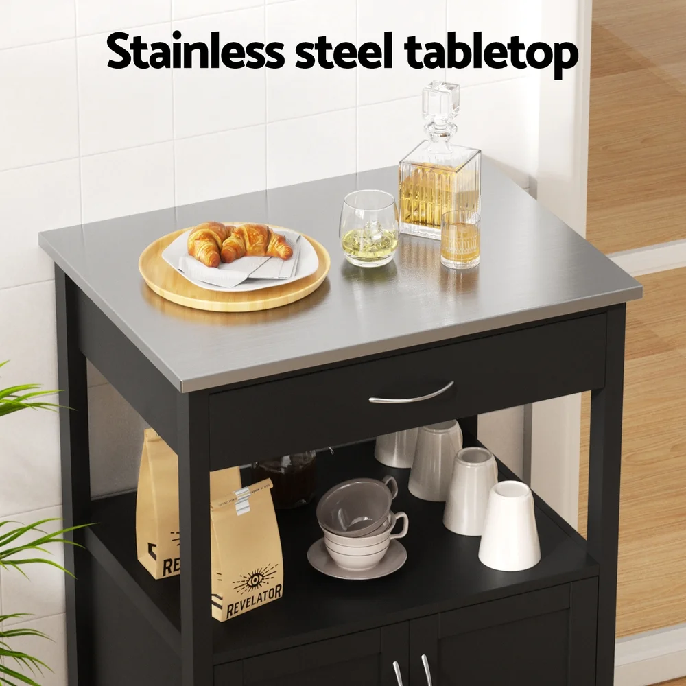 Introducing the Artiss Kitchen Island, the ultimate solution for extra counter space and smart storage in your home. This versatile unit is crafted with a durable stainless-steel tabletop, offering a sleek, easy-clean, and waterproof surface that's perfect for food prep, serving, or casual dining.