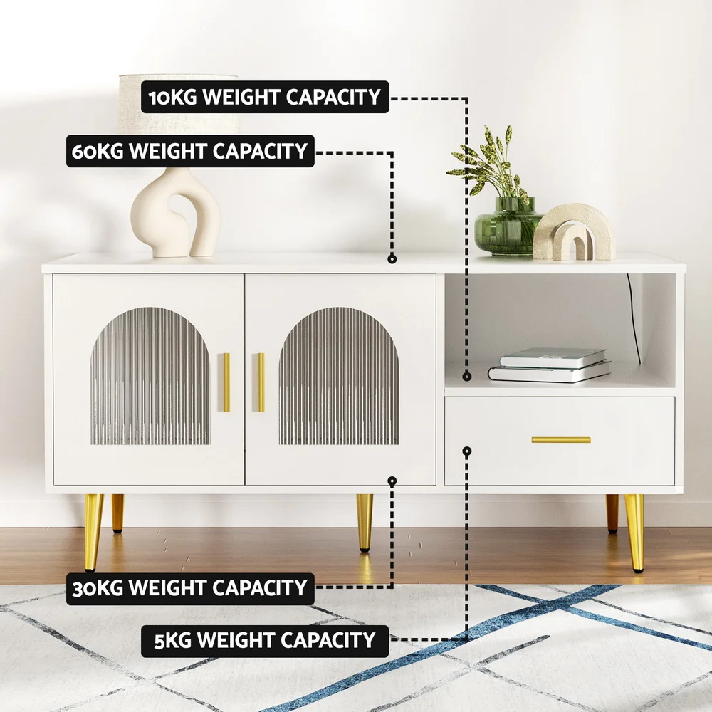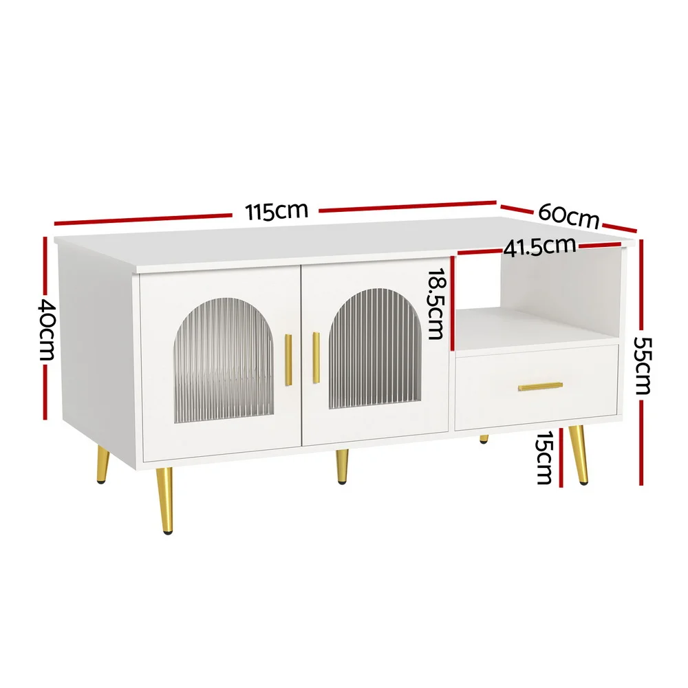 Introducing our contemporary Artiss coffee table with LED strip, USB connectivity, ample storage, sleek metal handles, melamine-coated particle board, reeded acrylic glass door, electroplated metal legs, smooth runners, easy maintenance, and assembly. Modern functionality meets stylish design.