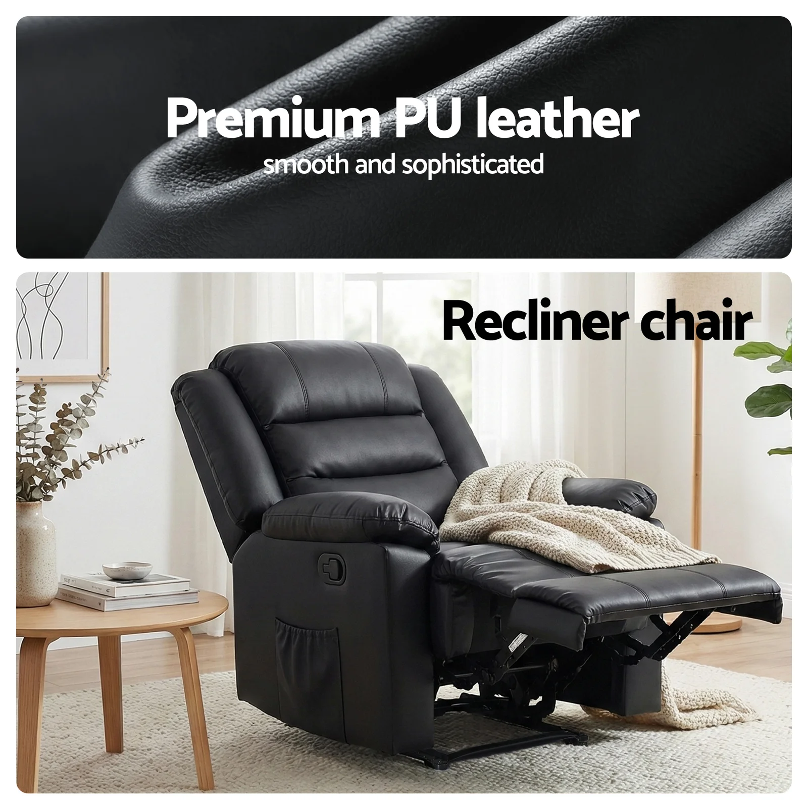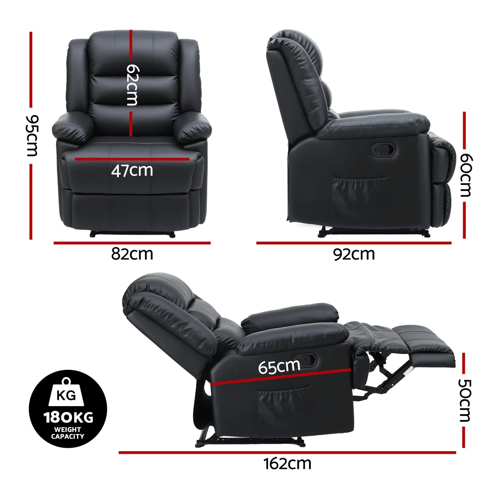 Transform your living space with our recliner chair, meticulously designed for durability and comfort. Crafted with a robust wooden frame that supports up to 180 kg, this stylish recliner sofa features an elegant PU leather finish that is not only easy to clean but also adds a modern touch to your living room furniture.