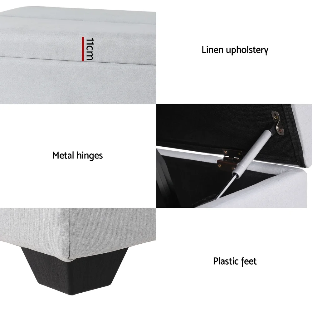 The Artiss storage ottoman bed with linen upholstery serves a dual purpose by providing ample storage while doubling as a bed. The hidden folding bed is a convenient space-saving feature for guests who wish to spend the night. The bed's sturdy plywood frame construction ensures stability and durability. The high-resilience foam padding enhances comfort, making it an ideal option for sitting or sleeping. The metal hinges offer smooth and straightforward operation, while the plastic feet protect the floor from scratches. This multi-functional piece can be used as a storage ottoman, coffee table, and sofa bed, making it perfect for small spaces. The storage ottoman bed is easy to assemble, making it a hassle-free addition to any room in your home.