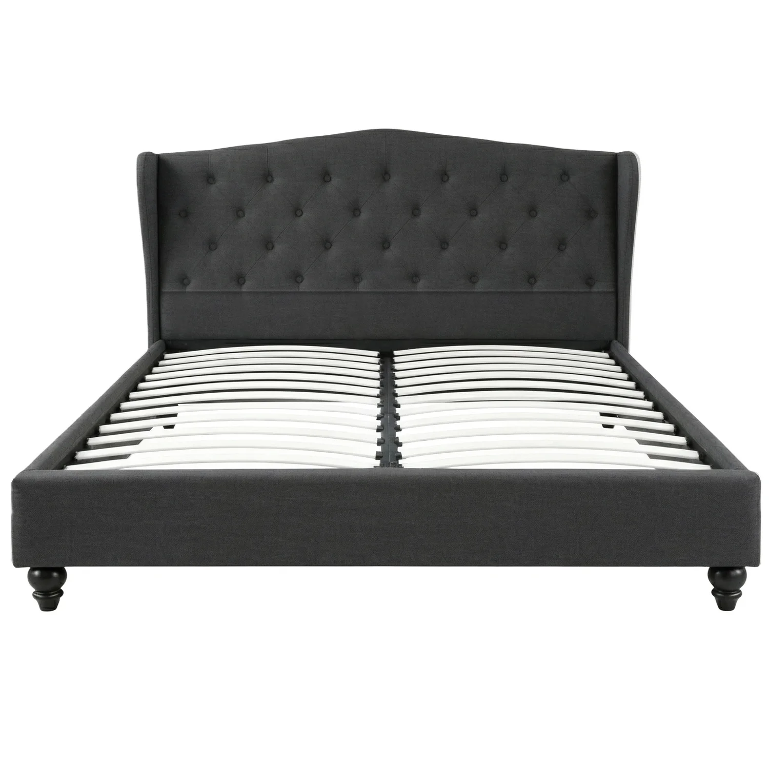 Elevate your bedroom with the Queen Bed Frame, featuring an elegant European-inspired wing headboard. Upholstered in premium woven linen fabric with tufted detailing and high-density foam padding for exceptional comfort. The robust steel frame construction features reinforced bars, heavy-duty connectors and wooden arched slats for lasting support. An adjustable centre strut enhances stability. Finished in versatile charcoal, this king size bed frame with headboard delivers timeless sophistication. Mattress sold separately