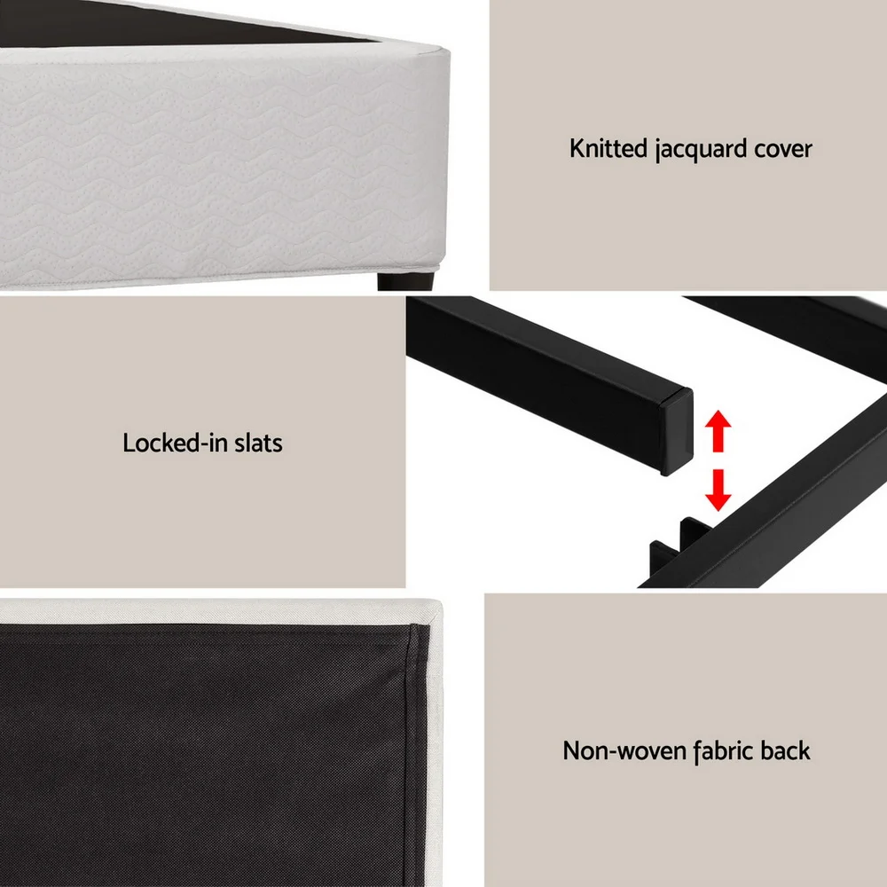 This Artiss queen bed frame combines a sturdy metal platform base with an elegant fabric headboard. The bed base features robust metal slats supporting your mattress without box springs, creating valuable underbed storage space. The pre-assembled headboard showcases sophisticated linen-look fabric with foam padding, supported by durable plywood. With reinforced connectors and scratch-resistant legs, this complete bed solution supports up to 300kg. Fits standard 151x200cm mattresses.