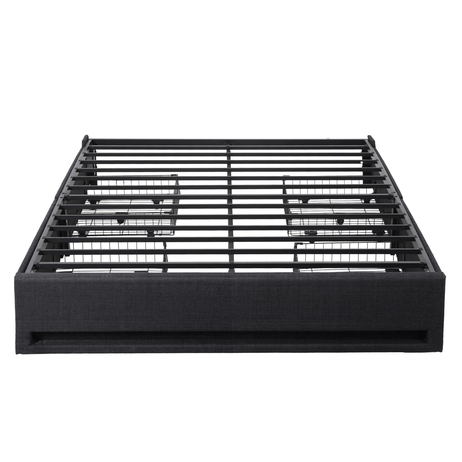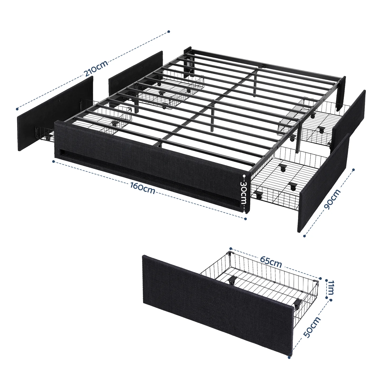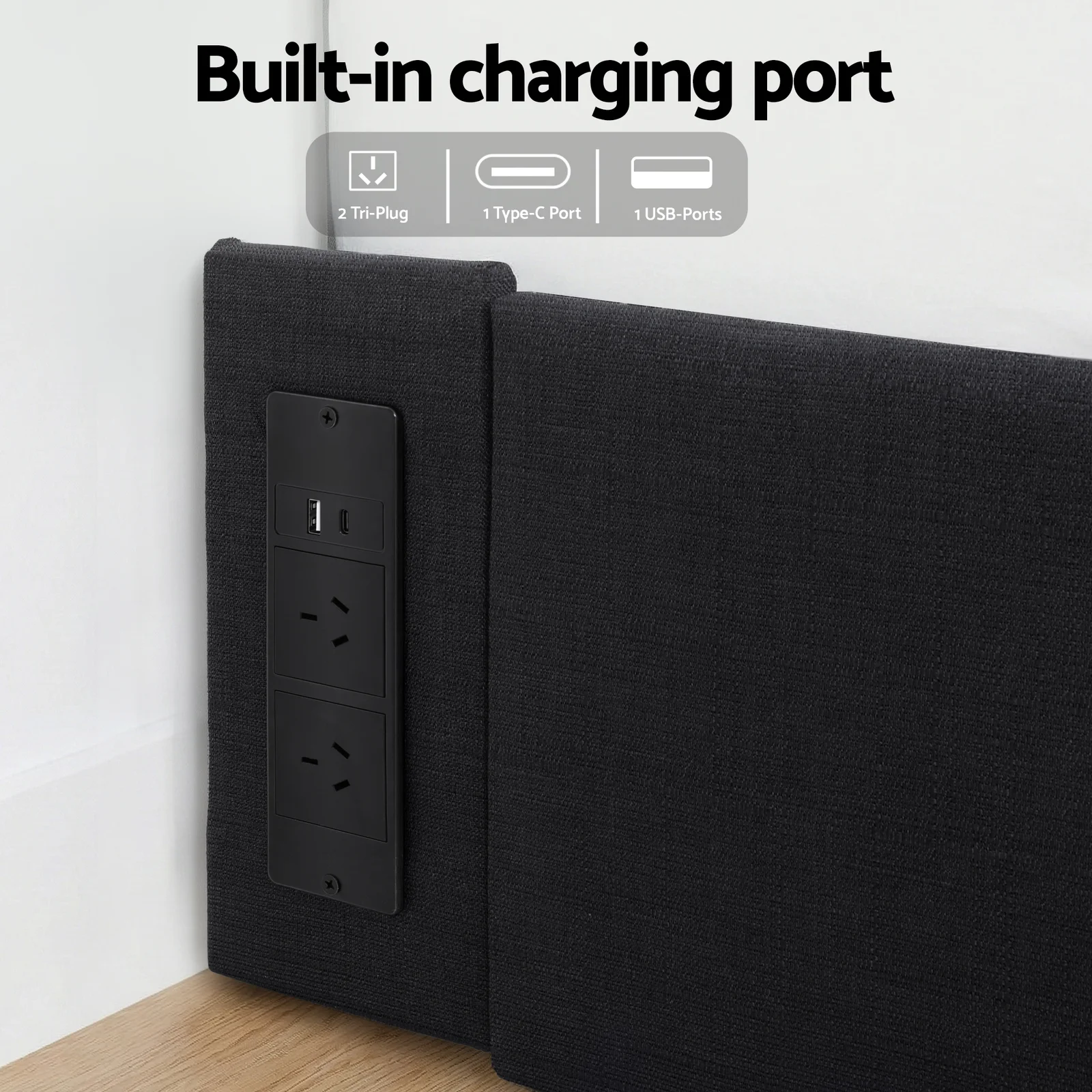 Upgrade your bedroom with this versatile queen bed base featuring integrated RGB lighting and practical charging solutions. The dual AC outlets + USB-C/USB ports (SAA certified) keep devices powered bedside. Customise your space with 16 adjustable LED colours through the footboard lighting. Four smooth-gliding drawers offer ample storage, while the sturdy pine/plywood frame supports 300kg. Enjoy flexible decor pairing with the no-headboard design, complete with breathable linen fabric and 13 supportive slats. Measures 160W x 210L x 30H cm.