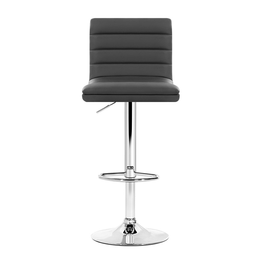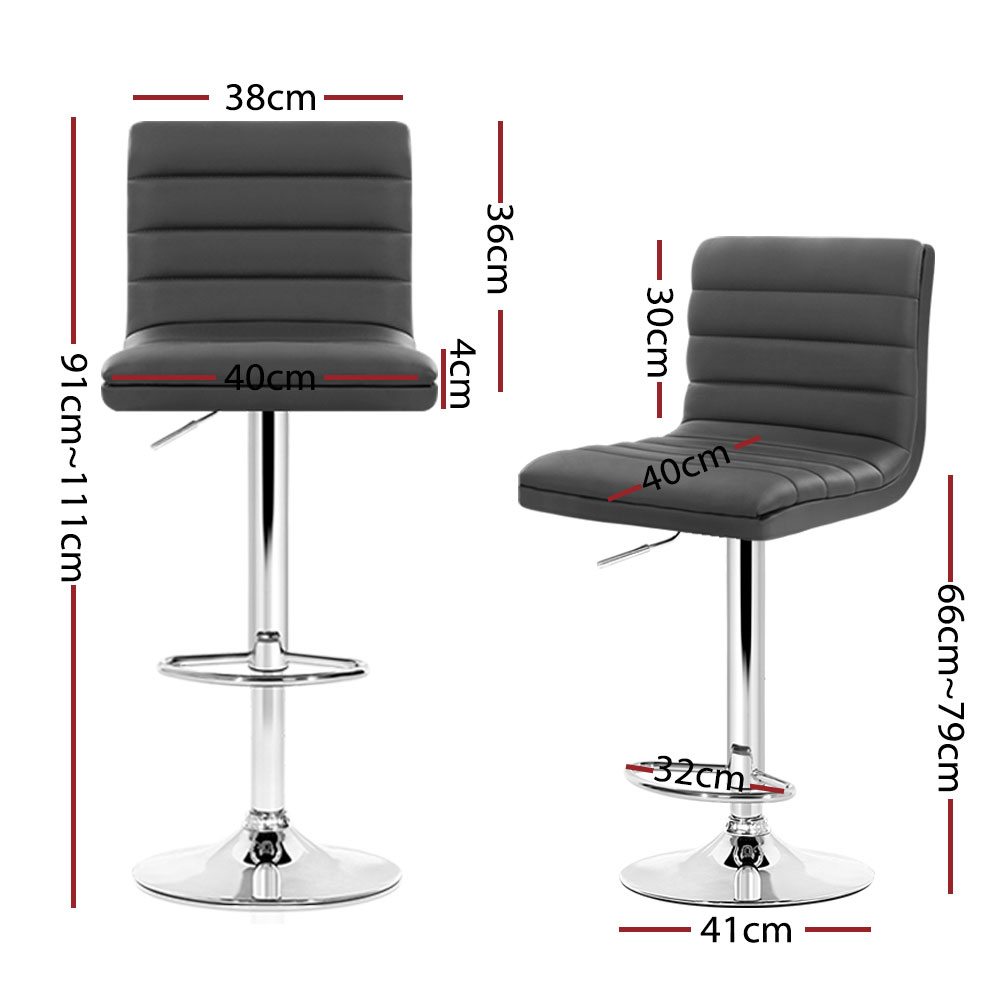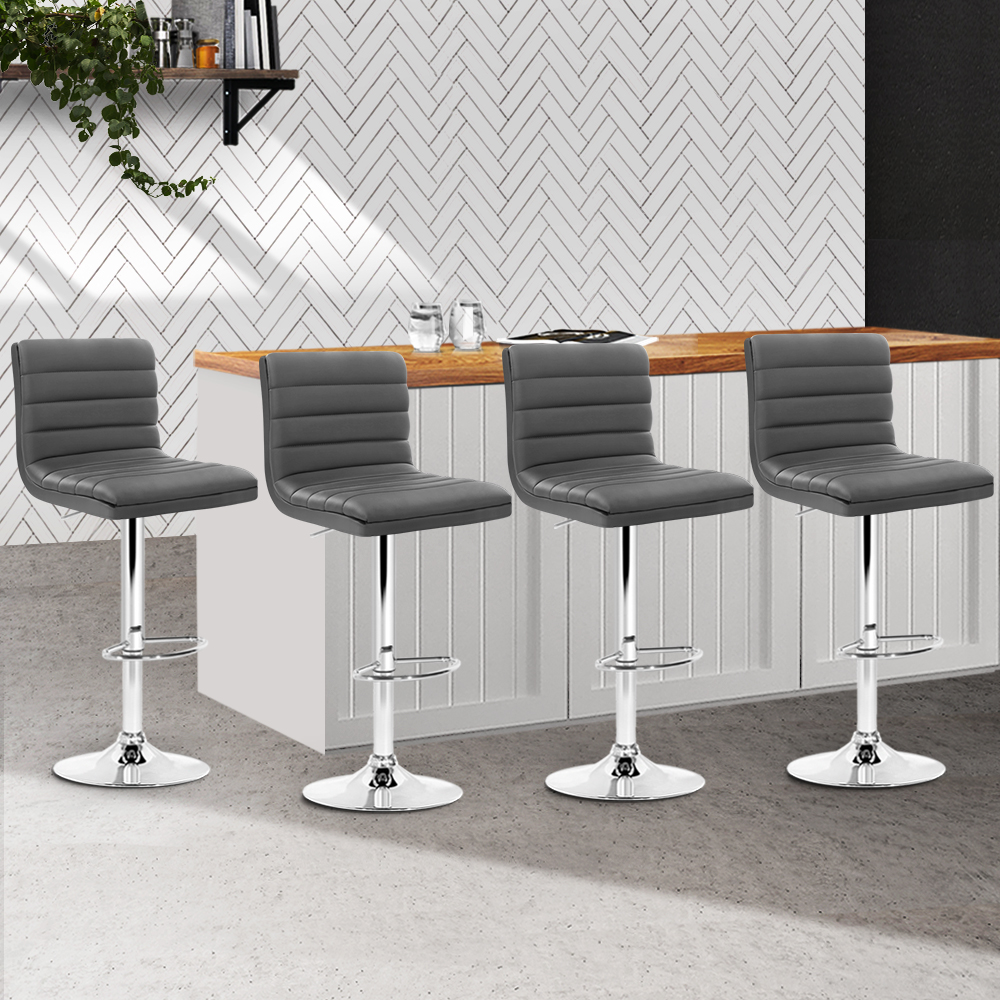 Update your dining and kitchen space with these modern bar stools which combine both class and comfort. Upholstered in faux leather, they feature an extra thick foam padded seat for ultimate comfort. The semi-circular footrest ensures relaxed sitting while the omni-directional seat makes for easy turn to the direction you wish to face. The height can be easily adjusted with the SGS-tested gas lift and the large base ensures stability at all times. Lastly, a floor protector under the base helps to keep your pristine floor scratch-free at all times. Features: Premium PU leather Supportive high backrest Extra thick foam padded seat 360 degree swivel seat SGS Tested gas lift lever Corrosion-resistant chrome finish Semi-circular footrest 41cm diameter steady base Floor protector under base Specifications: Seat material: PU leather Base material: Steel Finish: Chrome Seat height range: 66~79cm Weight capacity: 150kg Colour: Grey Package Contents: 4 x Bar Stool 1 x Assembly Manual