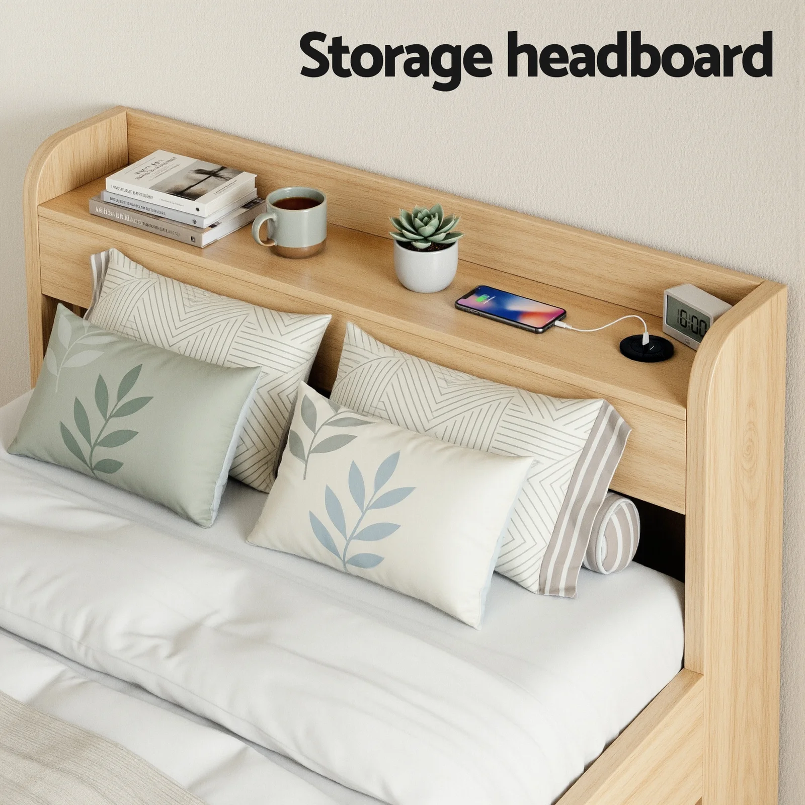 It's easy to sleep well on the Artiss Aura Bed Frame. Made from thick 15mm and 18mm particleboard with 12mm plywood slats and a natural paper finish, the bed frame is designed for long-lasting use and longer-lasting sleep. The thick plywood slats and centre beams provide total support, and noise-free use, and improve the life of your mattress. It features a multifunctional design that allows you to use the bed for storage and to charge your phone overnight. Two drawers with smooth castor wheels can be installed on the left or the right for convenient storage. The headboard has smooth edges and plenty of room for your bedroom essentials. It also features two USB charging ports connected to a 200cm cable for convenience. While you power down for the night, you can power up with the Aura Bed Frame from Artiss.
