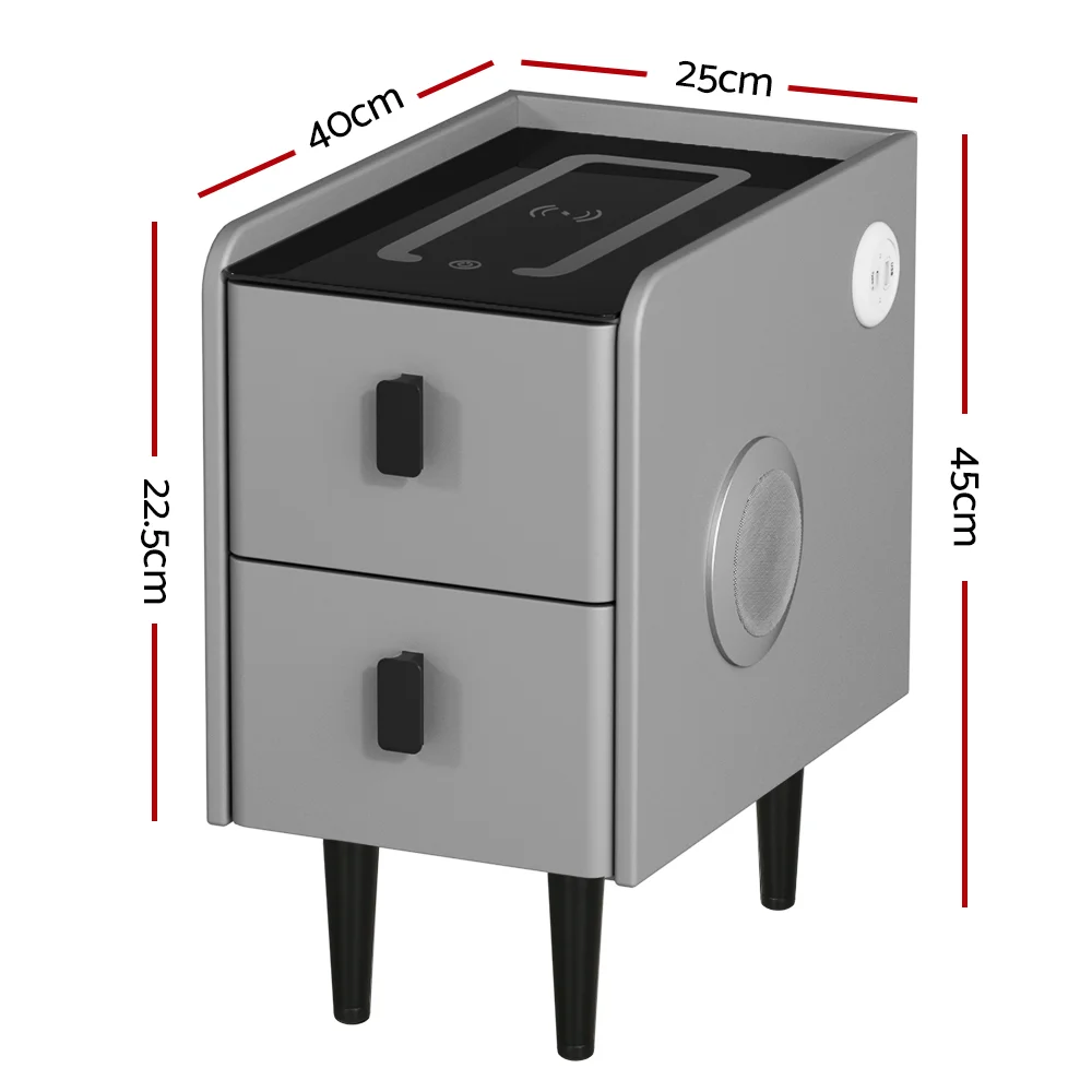 Upgrade your living space with the Artiss Aida Smart Bedside Table. The table allows you to charge your phone wirelessly or via USB, and also contains a Bluetooth speaker to listen to your favourite tunes. Constructed from quality MDF upholstered with premium PU leather and topped with a tempered glass tabletop, the smart table is perfectly stylish and durable. The two drawers feature sleek metal handles and ample storage space for all your night-time essentials. With one USB and one type C charging port, you can charge your devices both wirelessly and wired. Adjust the light-up charging panel to achieve the perfect ambience for sleep. The metal legs will keep your table standing, while anti-slip pads keep the piece in place and protect your floors. Easy to assemble and even easier to maintain, you'll love the style and functionality of the Aida Smart Bedside Table from Artiss.