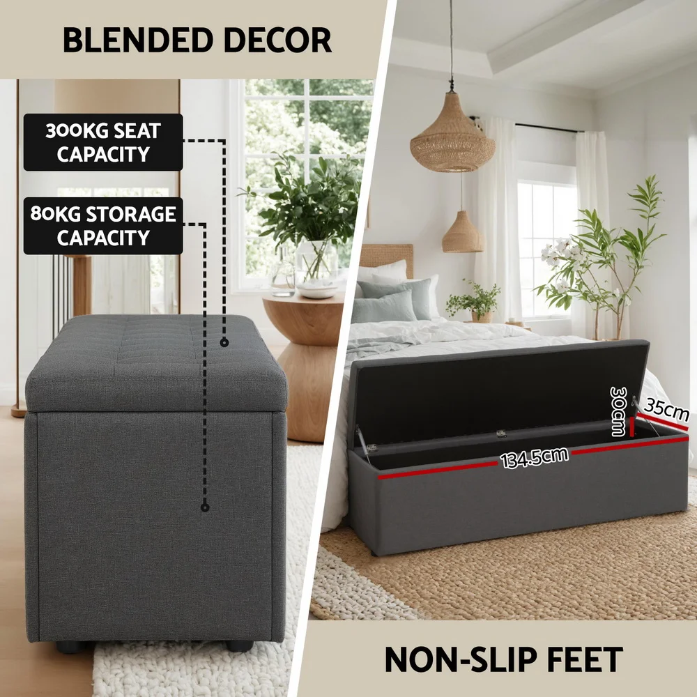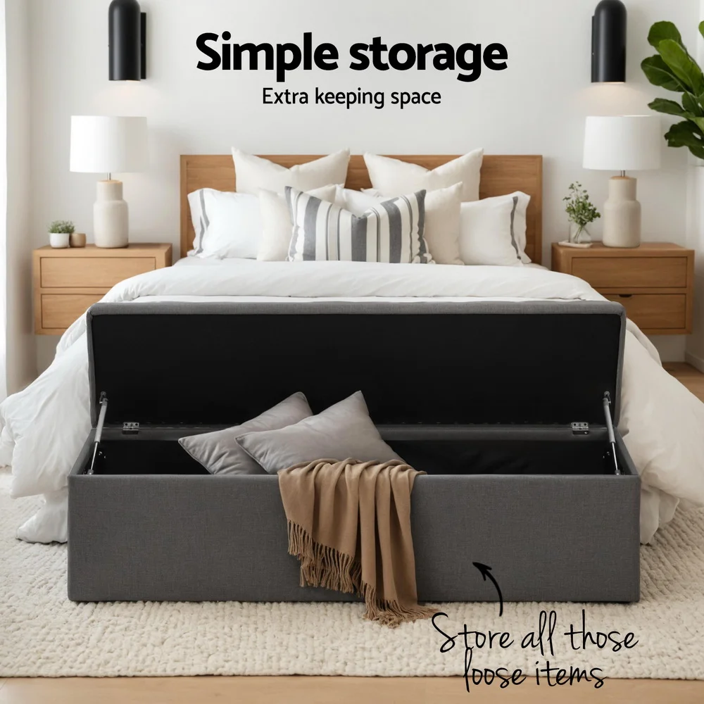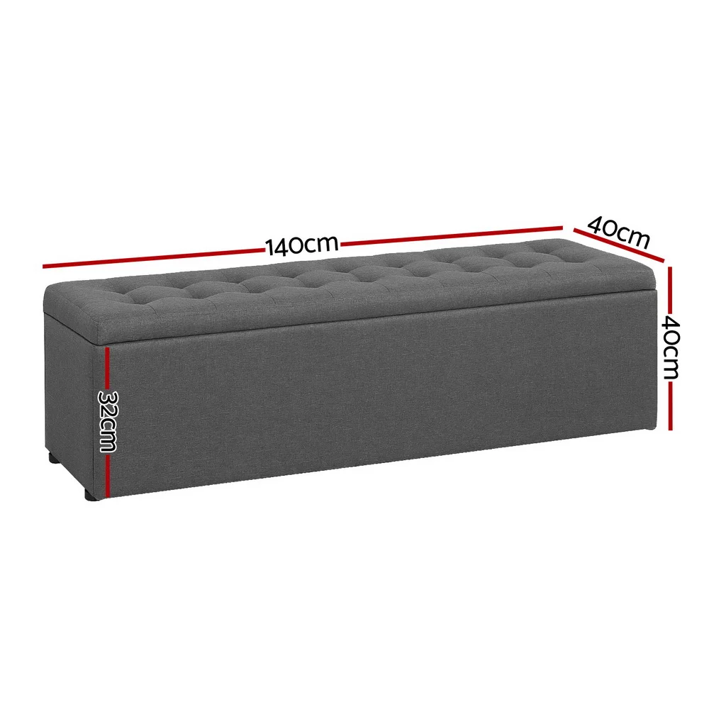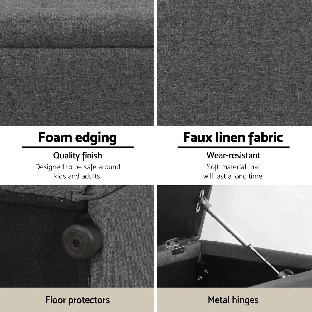 Looking for a storage solution with more taste? Look no further than our premium Artiss Storage Ottoman. With an elegant tufted seat and finished in skin-soft faux linen, our ottoman is simply luxurious to rest on and adds a plush touch to any home. But more than that, it also provides a neat storage space for your home essentials. Blankets, throws, pillows, magazines and even toys can be stowed away in a discreet, easy-to-access manner. Made of quality material, the ottoman is strong and sturdy and stands up to durable use. The lift-up top enables easy access while its robust metal hinges ensure that it will stay open and not falter easily. Not least, the ottoman has floor protectors to keep your pristine floor free from scratches. Best of all, the 140cm extra-long design means you have even more space for storage, resting your feet or sitting on. So whether you are using the ottoman as extra lounge seating, bedroom décor or your favourite footrest, our multifunctional and versatile ottoman matches form with function perfectly and elegantly.