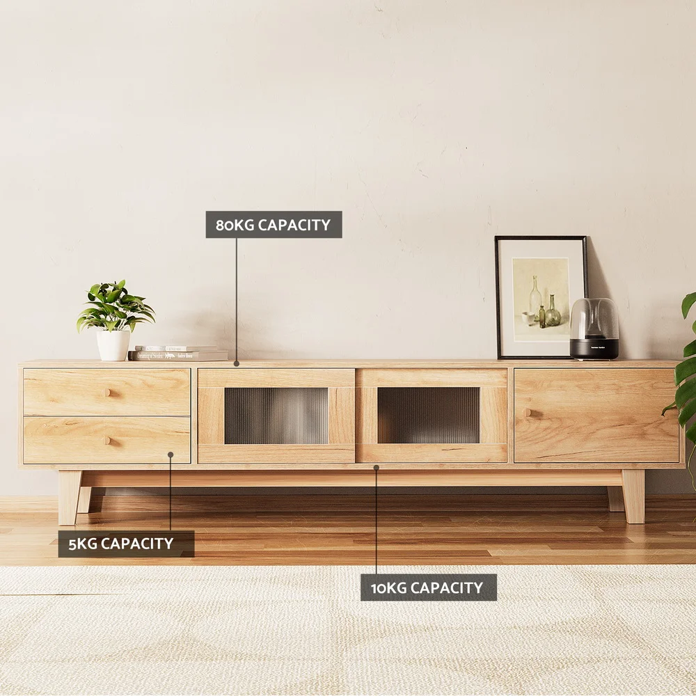 Constructed from melamine-finished particle board, this Artiss entertainment unit features durable metal hinges, a cable management hole, and sturdy rubber wood legs. It boasts a high weight capacity, low-maintenance cleaning, and simple assembly for added convenience.