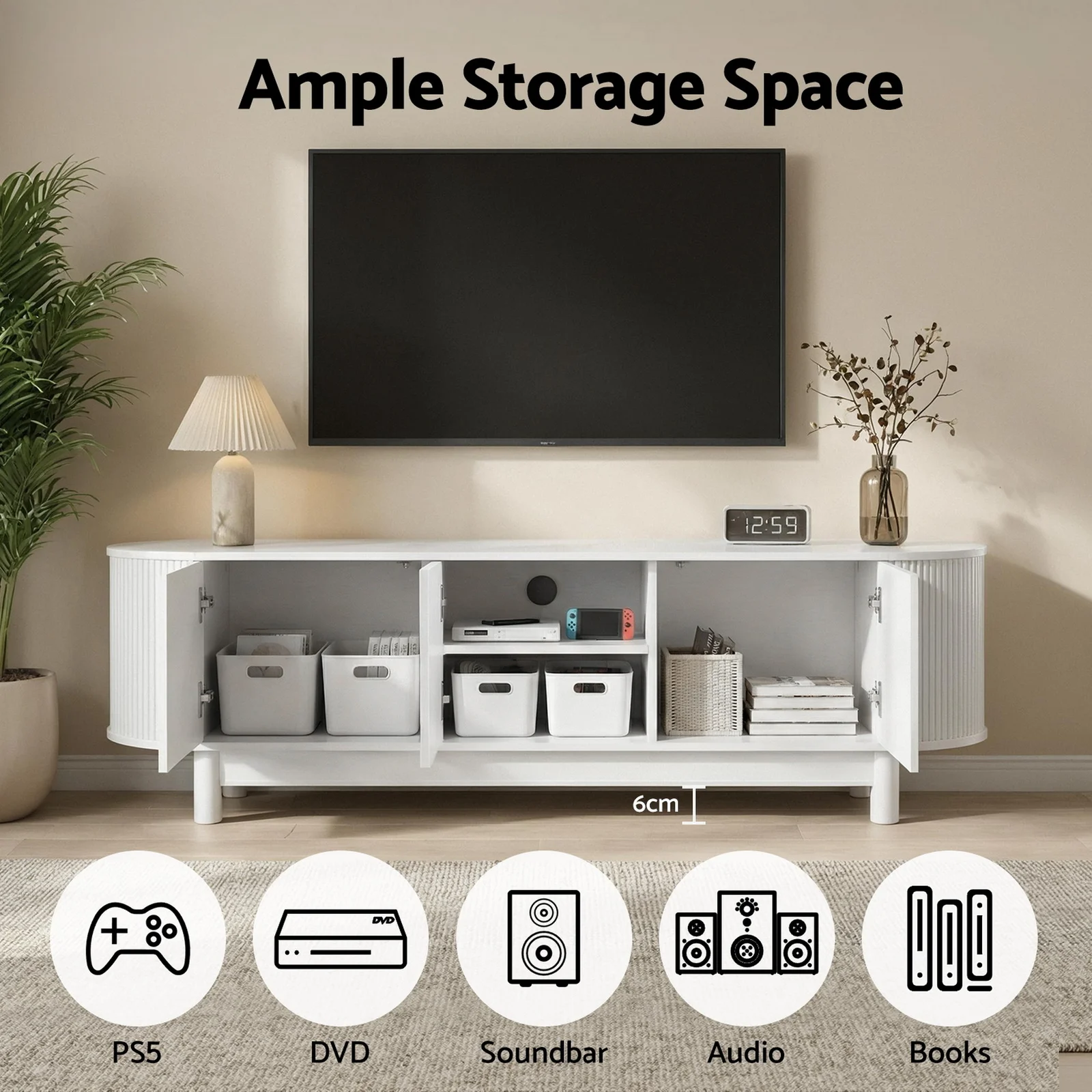 Keep your living room organised and looking sharp with this Artiss entertainment unit. It features 2 storage side cabinet flanking 2 tiers of middle shelves, perfect for media gear, consoles, books, or decor. Crafted from E1 15mm PB with a durable melamine finish, its sturdy construction offers a high weight capacity (tabletop holds 60kg, shelves 10kg each). Safety is covered with safe rounded corners and an included anti-tip kit. Enjoy smooth operation with push-to-open devices and soft close hinges on the cabinet. Solid wood feet with foot pads ensure stability on timber floors. A discreet cable management hole helps keep cords organised.