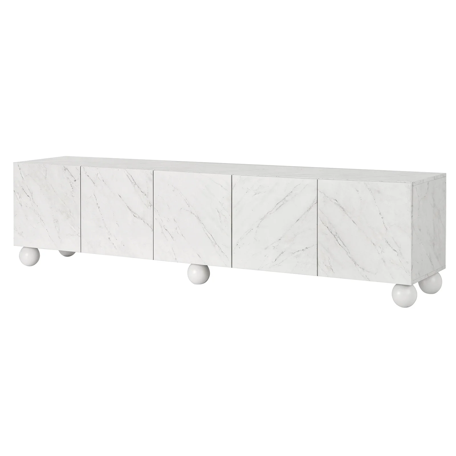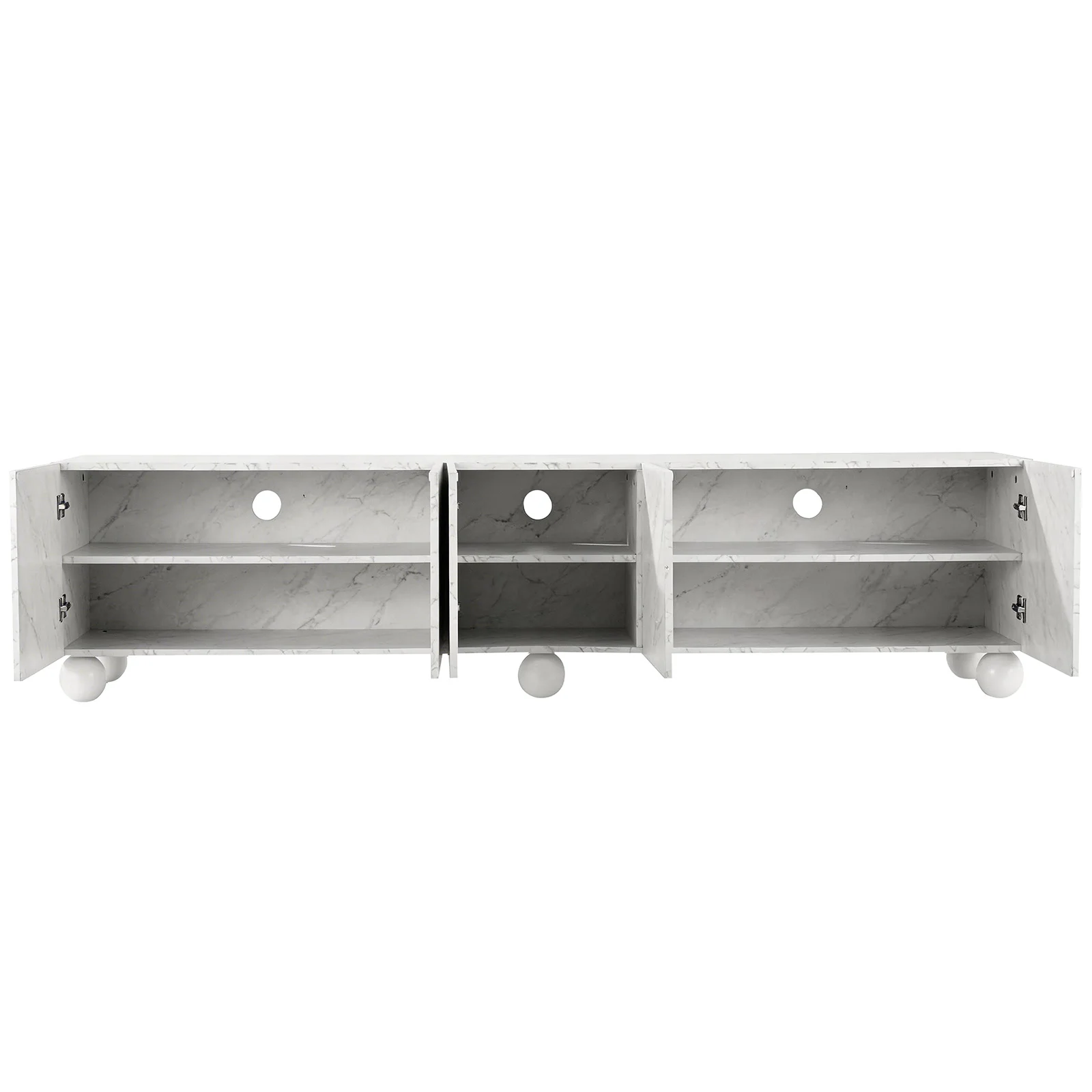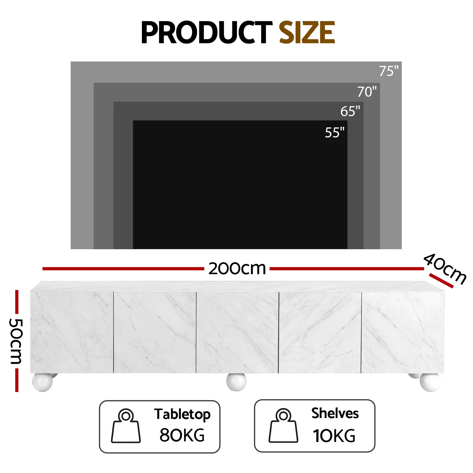 Elevate your lounge room with this ultra-spacious 200cm white TV unit. Measuring 200x40x50cm, the sturdy benchtop safely supports large flat-screen TVs up to 75 inches with an impressive 80kg weight capacity. Featuring a premium marble-effect finish and unique ball-shaped solid rubber wood legs, it seamlessly blends modern elegance with robust support. Keep your space clutter-free using the deep storage cabinets, equipped with premium soft-close hinges for a quiet and safe household. Built from durable E1 MDF, it includes handy cable management holes to hide messy wires out of sight. The scratch-resistant surface is easy to clean. Shipped in 3 packages; simple assembly required.
