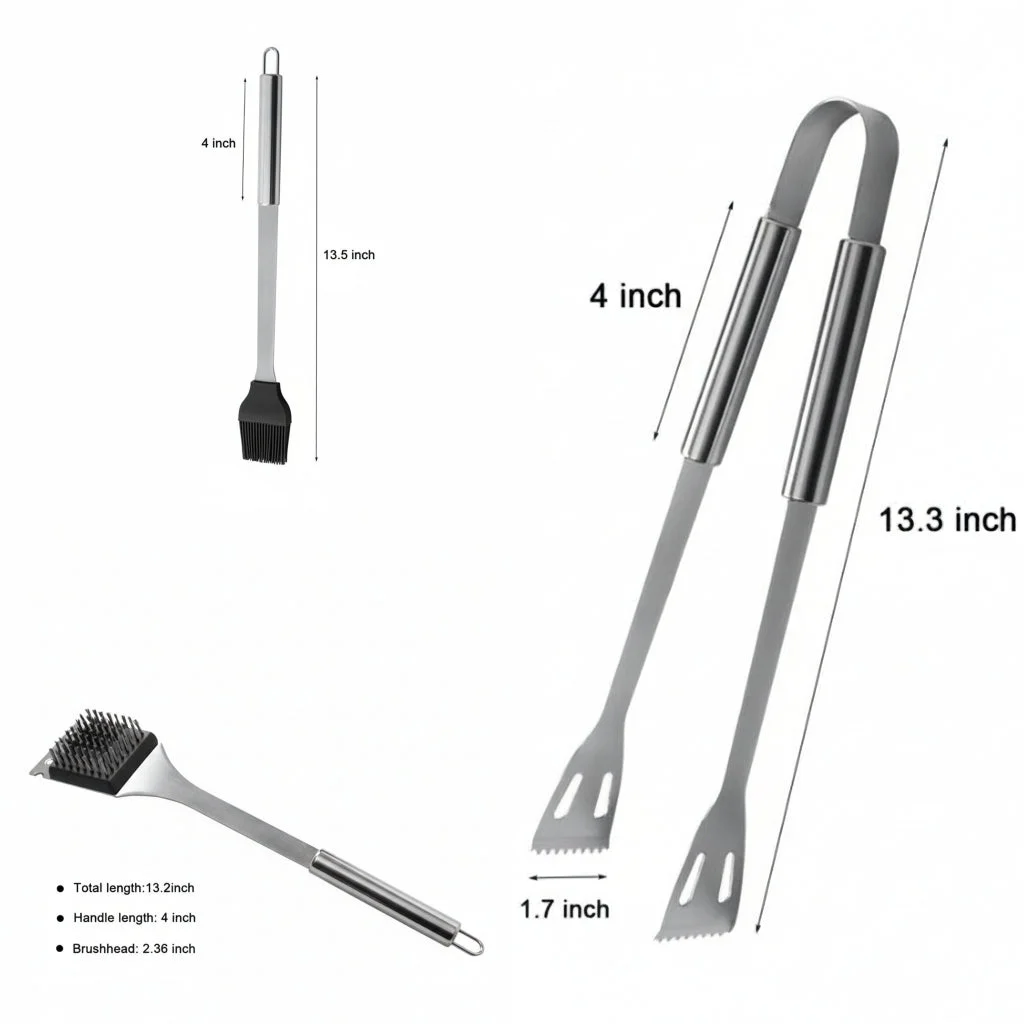 - 1 x 6-Piece BBQ Tool Set(Knife, Fork, Tongs, Spatula, Basting Brush, Cleaning Brush)