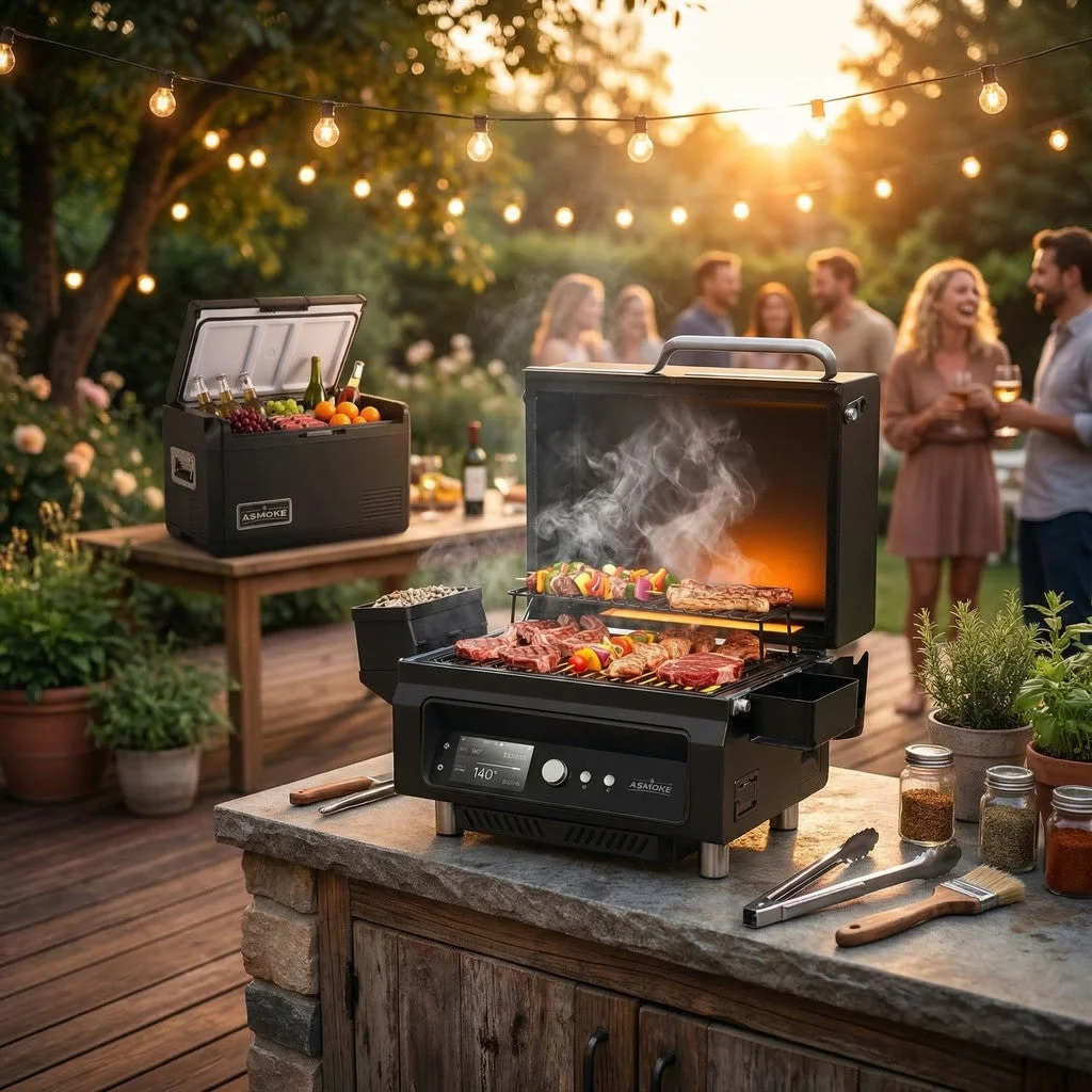 All-in-one outdoor kitchen, anywhere. Elevate your outdoor cooking game with the ASMOKE Essential and portable fridge. Combining state-of-the-art smart technology with authentic wood-fired flavour, this battery-powered grill allows you to smoke, roast, and barbecue with precision - whether you are in the backyard or camping off the grid. The premium mini fridge features a roll-bond evaporator capable of cooling down to -20C.