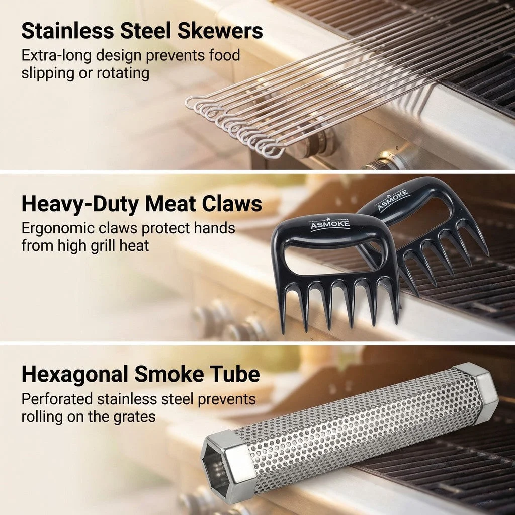 Master the art of wood-fired flavor with the ASMOKE Essential Smart Grill. This all-in-one bundle is curated for the serious BBQ enthusiast, featuring a battery-powered 8-in-1 smart grill, a dedicated stainless steel smoke tube for extra infusion, heavy-duty meat claws for perfect pulled pork, and 10 premium skewers. Combined with our 100% pure Applewood pellets, you're ready to smoke, shred, and sear like a pro anywhere in Australia.