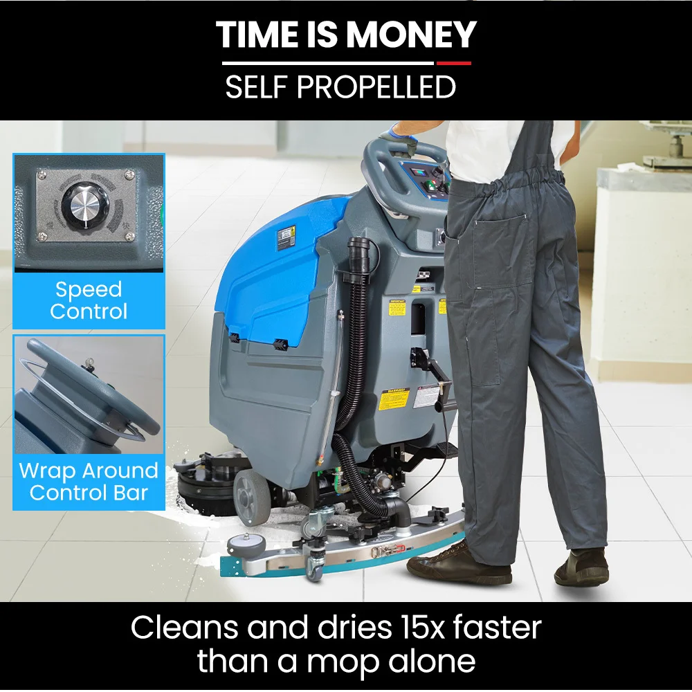 Pulling the ergonomic wrap around control bar activates the self propel function, which enables the operator to focus their energy on the rewarding cleaning task at hand. The dual-handle design with accessible switch controls enhances user comfort and safety, making it ideal for prolonged use in commercial settings.