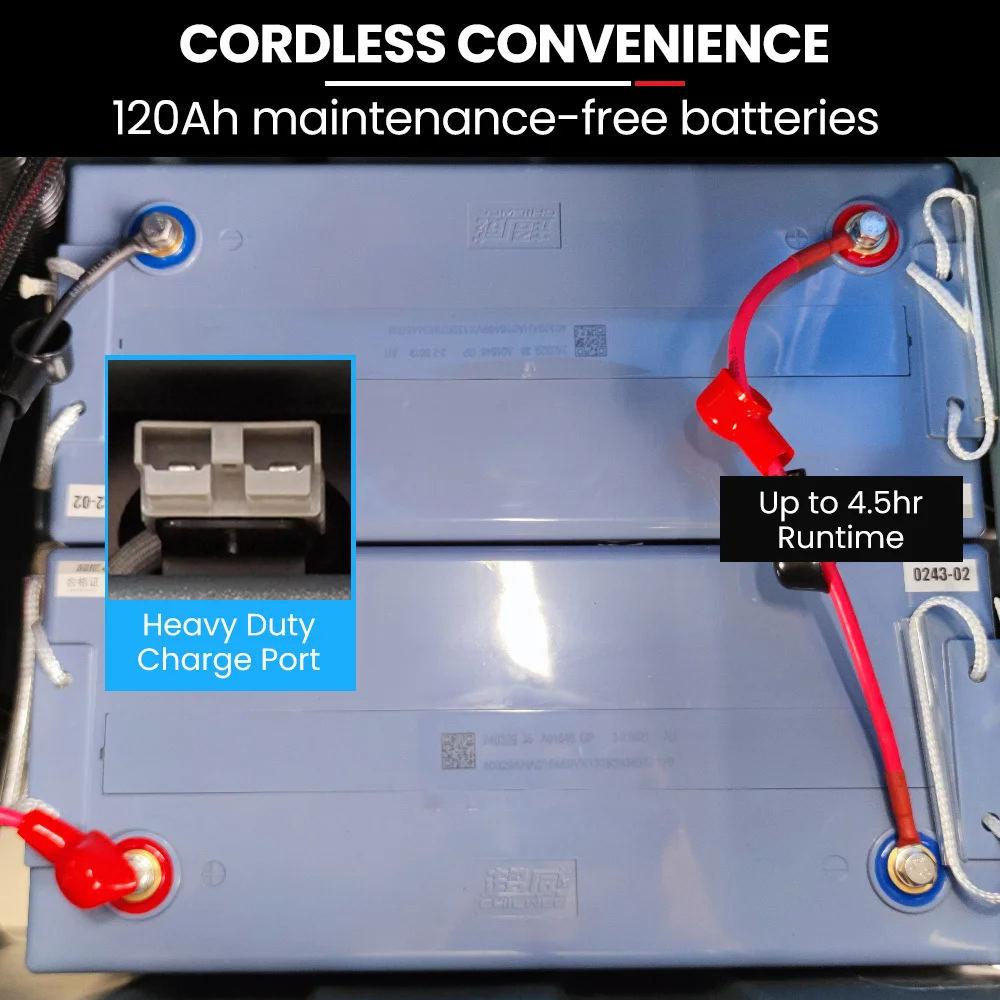 Freedom from cords enhances this scrubbers utility, powered by dual 12V/120Ah sealed maintenance-free batteries, ensuring up to 4.5 hours of continuous operation.