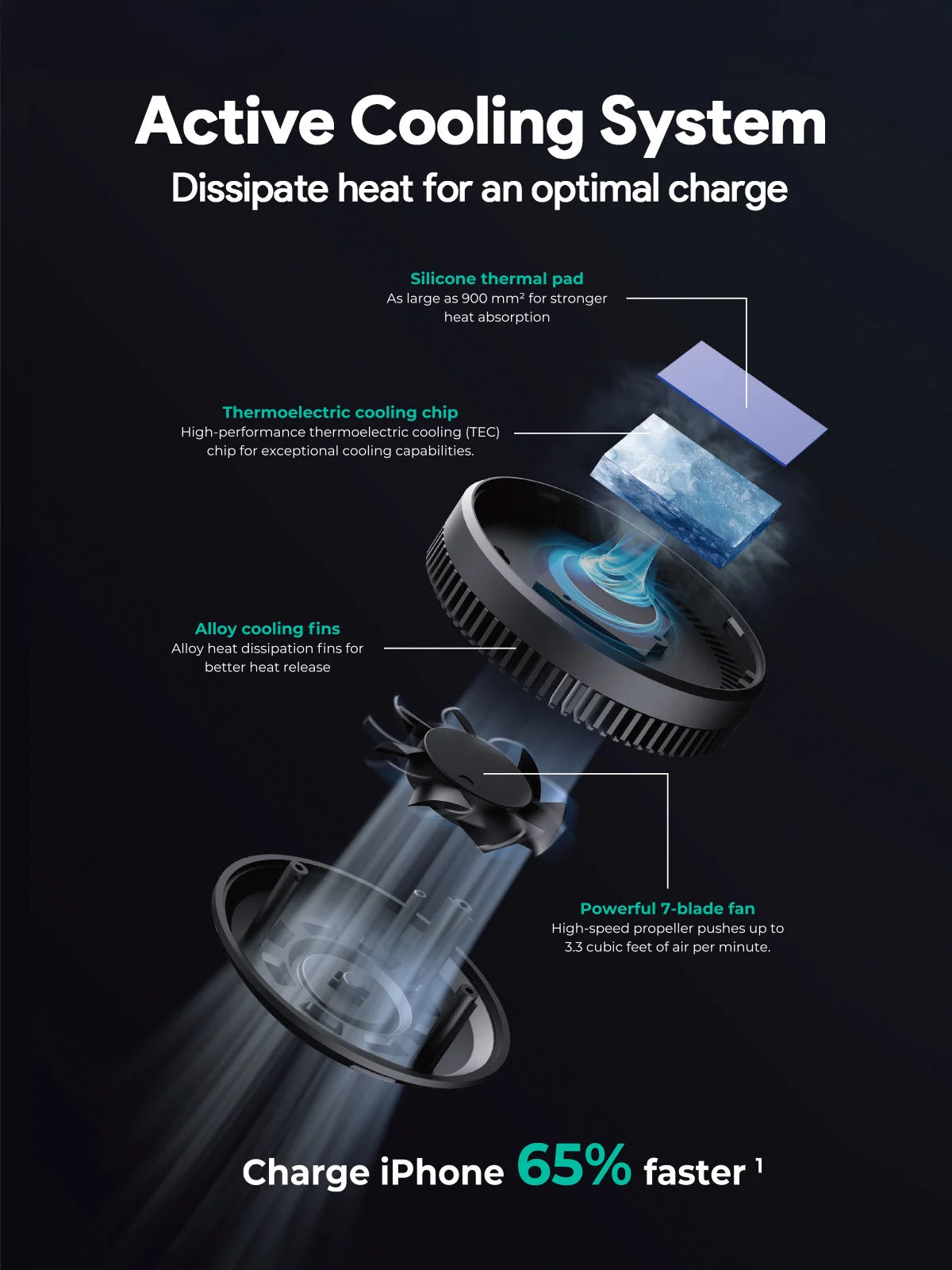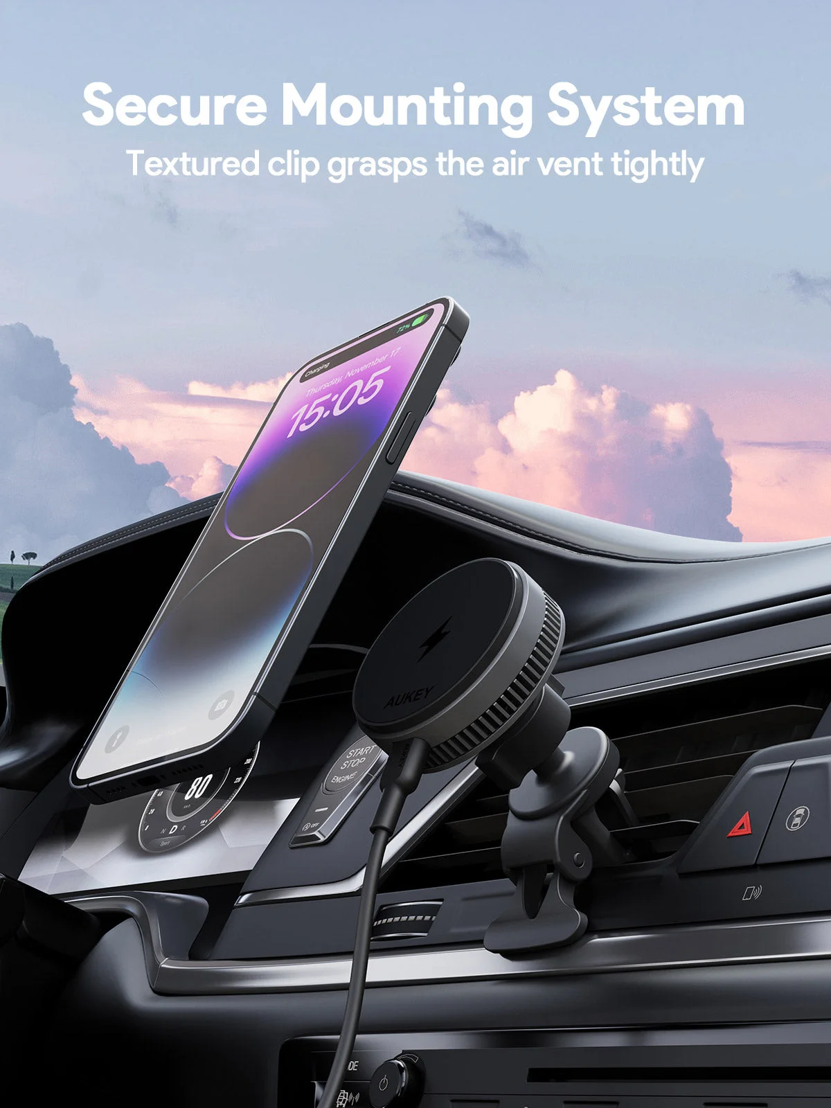 Aukey Wireless Car MagSafe Holder/Charger 15W (HD-MC13A) provides fast 15W charging with MagSafe compatibility for secure and convenient phone mounting, as well as a new cooling fan to prevent your phone from overheating.