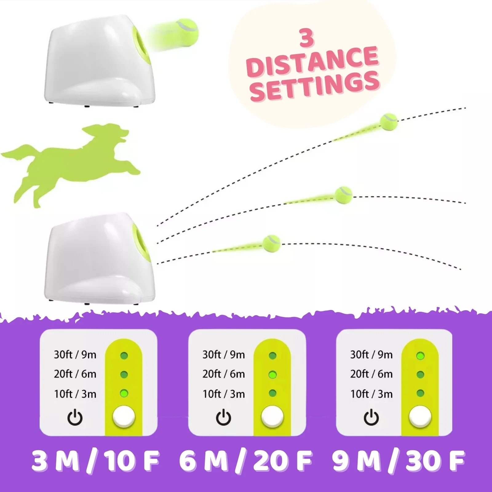 - 3 Adjustable Launch Distances- Easily change the launch distance with push of a button. 3 settings of 10feet (3m),20feet(6m) or 30feet(9m) to easily adapt to the surroundings.