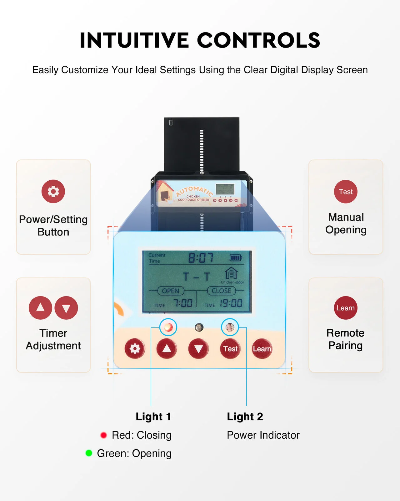 - Enhanced Safety Features: Equipped with an infrared sensor that detects and protects your animals by preventing the door from closing when an obstruction is detected, ensuring the safety of chickens, rabbits, and other small livestock.