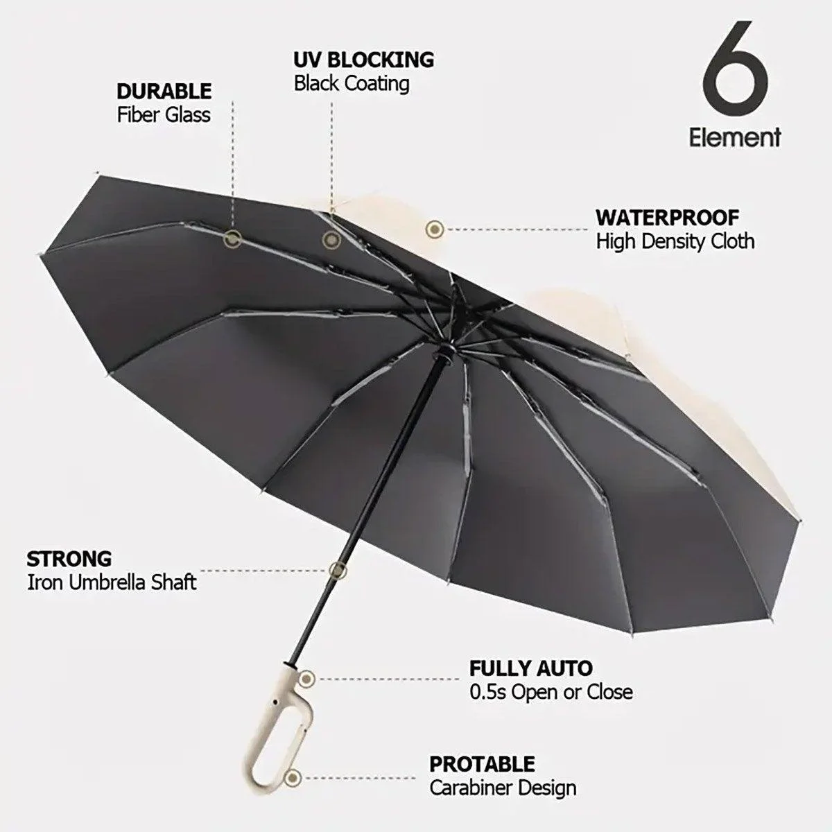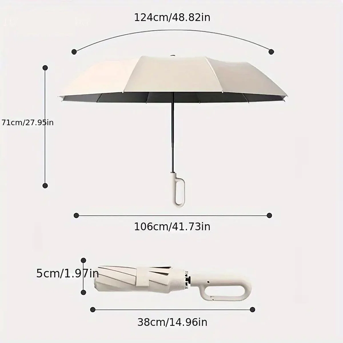 This automatic folding umbrella is a versatile accessory designed to offer reliable protection from both the sun and rain, making it perfect for year-round outdoor activities. Featuring a high-quality UPF50+ UV blocking layer, it shields you from harmful sun rays, while its high-density waterproof fabric ensures you stay dry even in heavy rain. The compact and lightweight design allows for easy storage in bags or backpacks, and the ergonomic buckle handle offers convenient portability. Built with durable fiberglass ribs and a strong iron shaft, this umbrella is designed to withstand windy conditions, making it an essential accessory for anyone, anywhere.