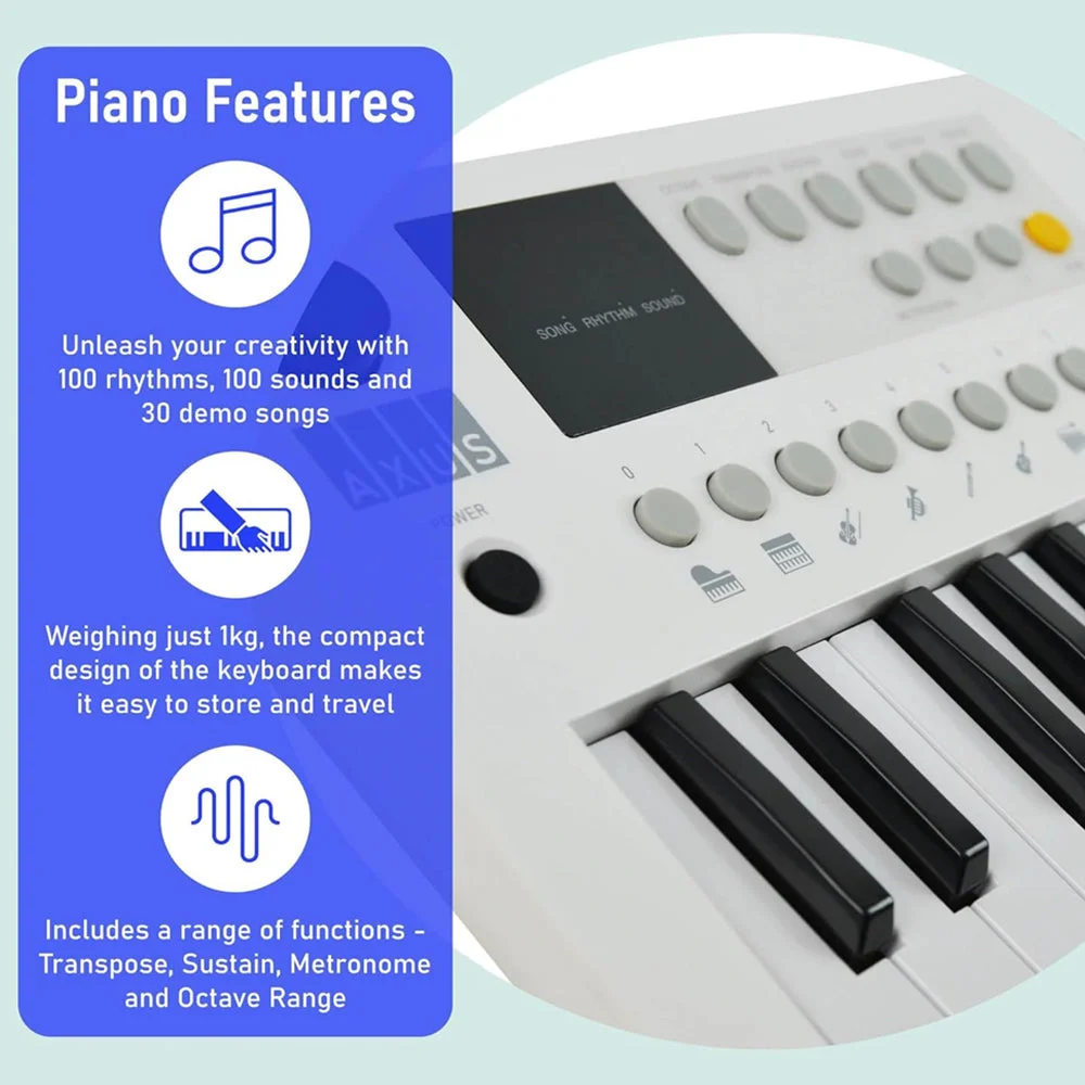 Axus Mini Keyboard 37 Key Keyboard - White - Introducing the Axus Mini Keyboard – a compact and portable instrument ideal for beginners. Designed with 37 mini keys, it’s perfect for young learners or those with limited space. Its lightweight build makes it easy to carry and set up anywhere, whether at home or in music classes.