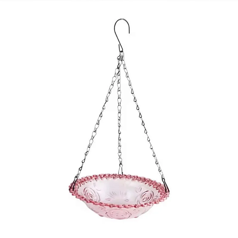 Enhance your outdoor space and invite birds to visit with this hanging glass bird bath and feeder. Crafted with a beautifully textured pink glass bowl and supported by a sturdy metal chain with an "S" hook, it offers dual functionality as a feeder or bird bath. Its compact size and elegant design make it ideal for balconies, gardens, and fences. The removable bowl ensures effortless maintenance, while the vibrant finish adds a decorative touch to your garden.