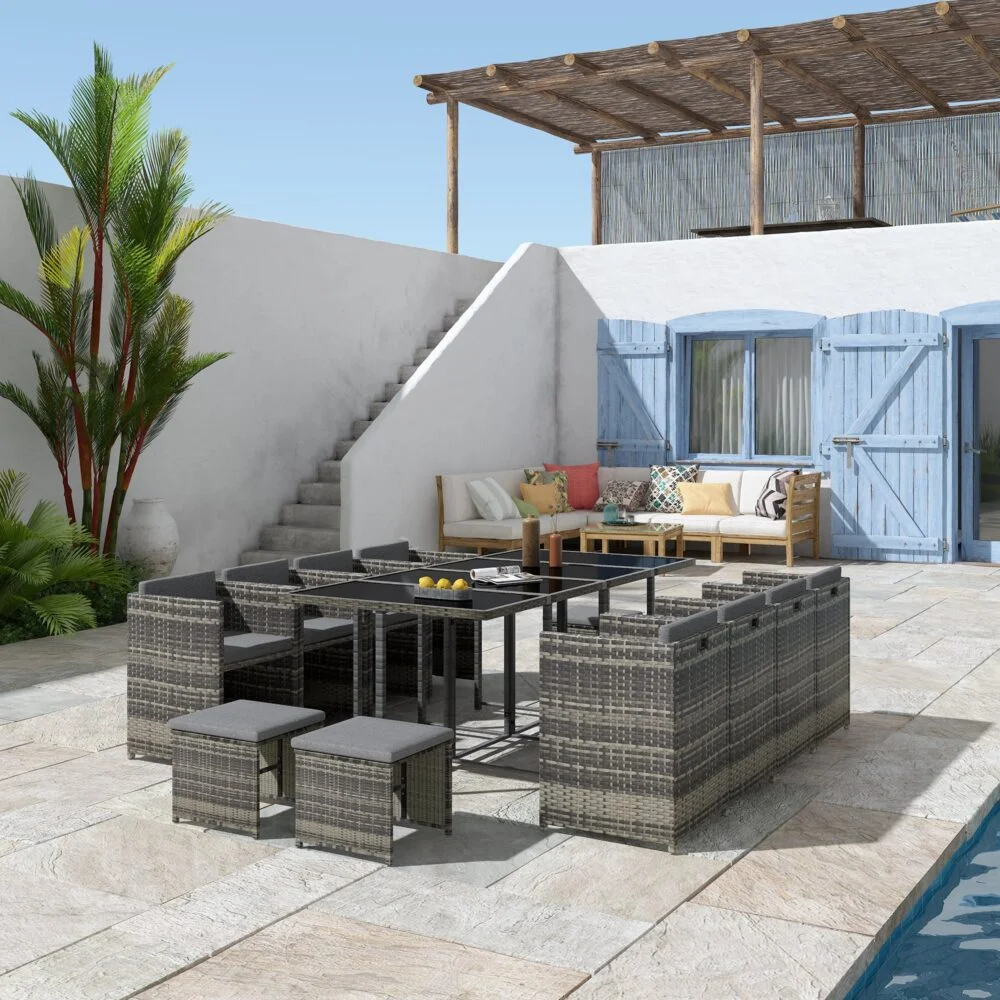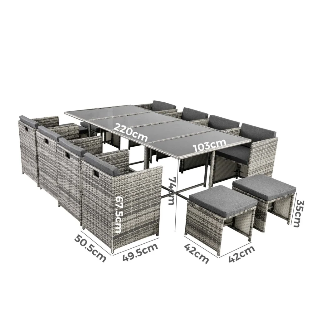 With a rustic yet modern look, the Bali 13 Piece Outdoor Dining Set is both fashionable and sophisticated. Thanks to its durability and smart design, it is a flawless fit for almost any garden arrangement and adds an extra touch of luxury to your outdoor spaces. The rattan furniture is sure to be a hit among your family and guests, helping you create a beautiful outdoor environment you can enjoy for summers to come.