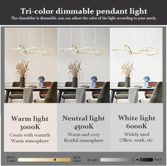 Add a touch of Elegance to your space with our Nordic Minimalist LED Pendant Light. Perfect for dining rooms, bars, and living rooms, this creative chandelier features a unique ring design crafted from durable stainless steel with a luxurious titanium black finish. The light offers flicker-free, fine, and comfortable illumination with three adjustable color temperatures: cool white, warm white, and warm yellow, allowing you to set the perfect mood. The adjustable suspension wire adapts to various ceiling heights, making it versatile for different floor levels. The energy-efficient LED light source provides high brightness and true color rendering while protecting your eyes. With a high-temperature baking paint process, this chandelier is built to last and is suitable for both ceiling and integrated ceiling installations.