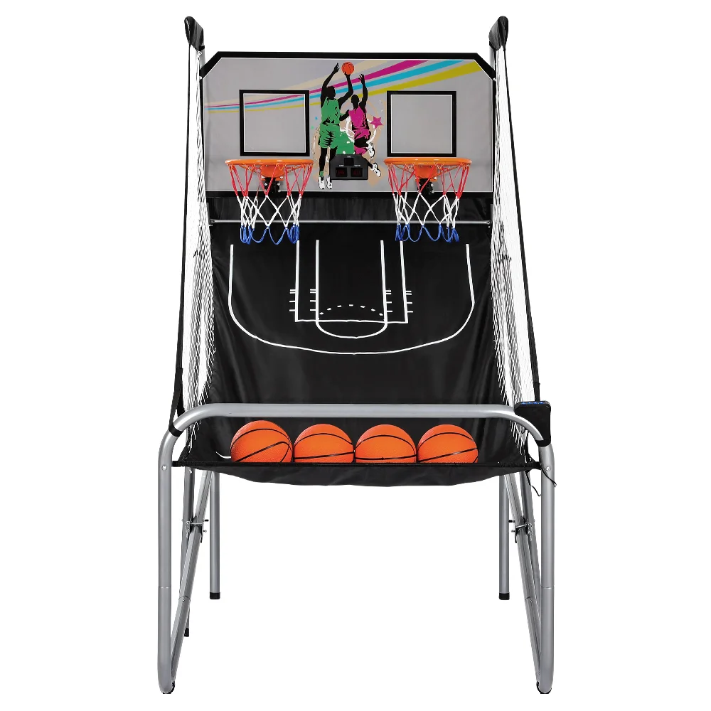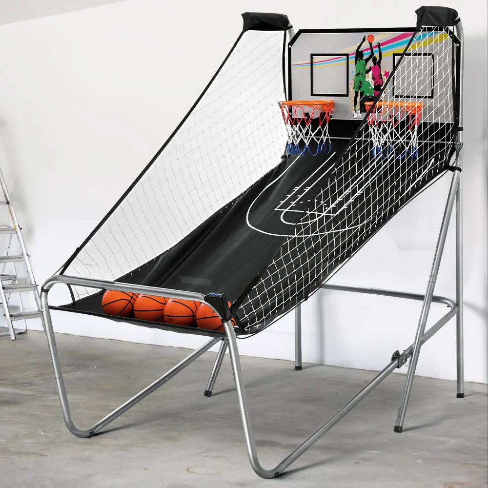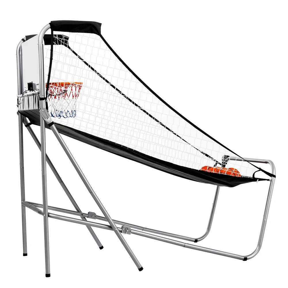 Bring the thrill of the arcade home with your very own Basketball Shooting Machine. The game is made from quality coated steel tubes that are rust-resistant as well as waterproof and stain-resistant printed polyester fabric that is sturdy and durable, so you can use it indoors or outdoors. Comes with 8 different popular game modes to challenge your friends and family to thrilling games of skill. Realistic sound effects make you feel like you’re actually at your local arcade hotspot. The LED automatic score counter provides an accurate and impartial referee for two players, no fighting on the courts! The high net catches stray balls and returns them quickly and easily so you can get back to fun. The triangle frame design and anti-slip feet always keep the game stable. With a foldable, portable and easy-to-assemble velcro design, you can play basketball in minutes, whether at home or on the road. Includes a bonus of four basketballs to always keep the fun rolling. Game on to victory with your very own arcade-style Basketball Shooting Machine.