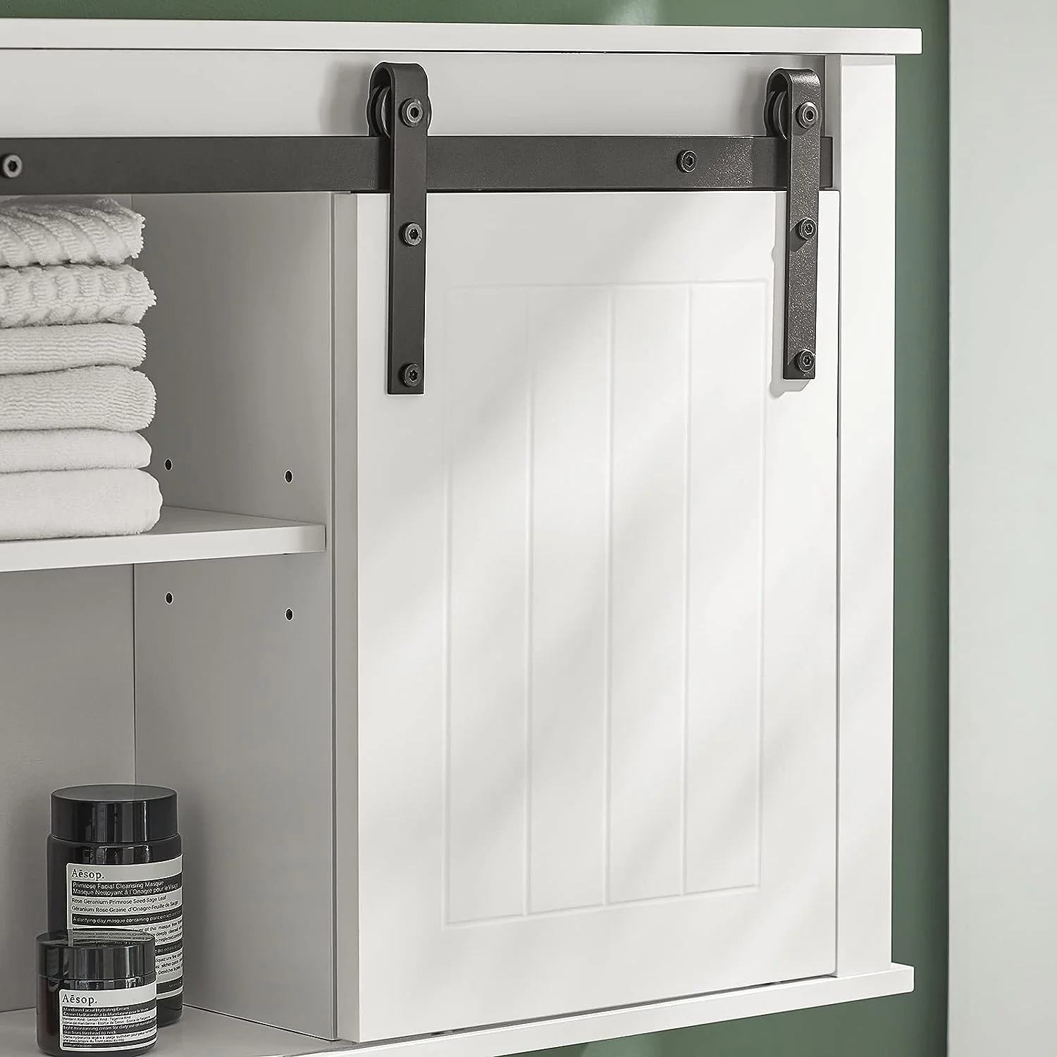 - This bathroom cabinet adds a stylish touch to your bathroom with its metal frame and sliding door. It provides an elegant storage solution for all your bathroom essentials, keeping them organized and out of sight.