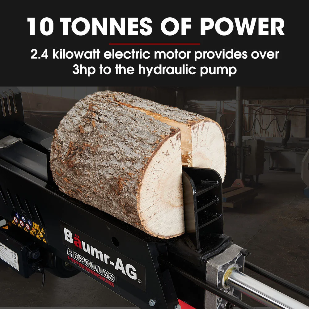 The Baumr-AG Hercules Series HPS3800E 10 Tonne Electric Log Splitter gives you the power previously only offered by petrol and diesel models - without the maintenance hassles. With a large encased hydraulic ram and concave bed design you can split logs up to a large 320mm in diameter and an impressive 520mm length! You can also work fast with a cycle time of only 14 seconds in the faster of the two speed modes.