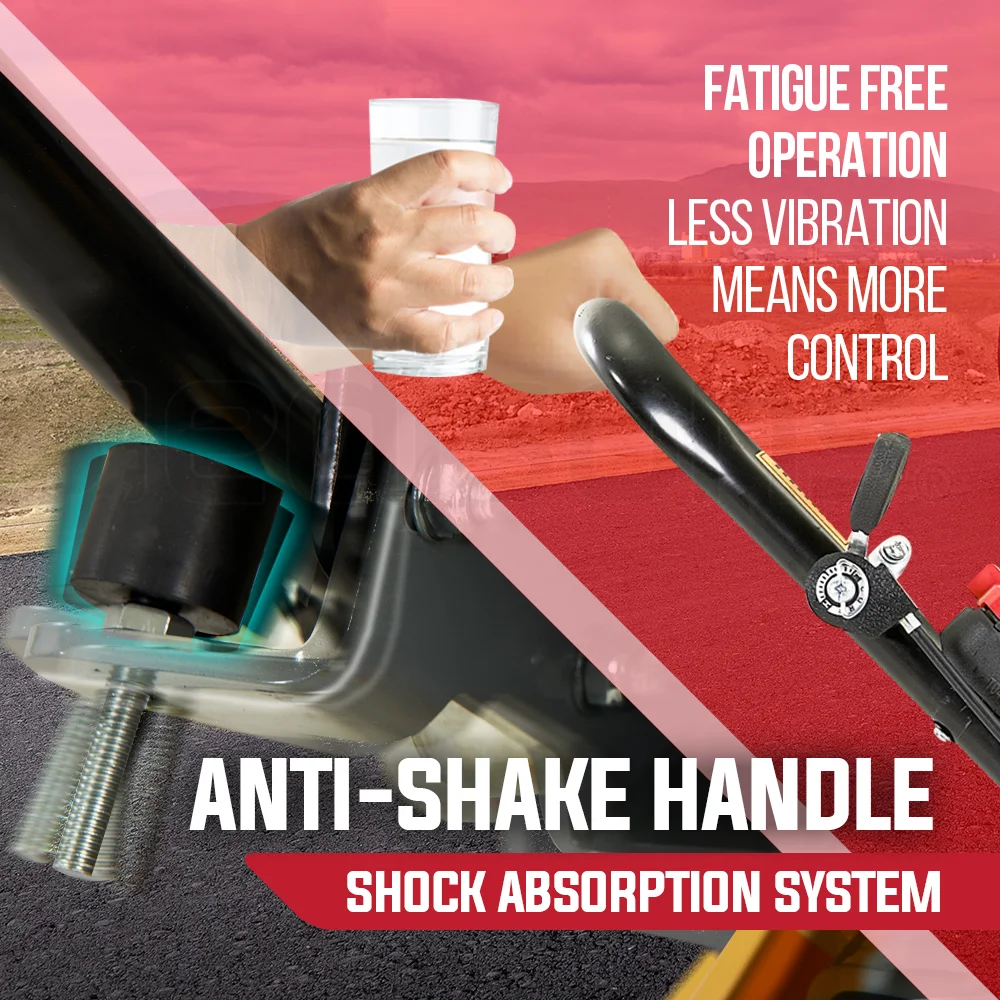 An integrated sprinkler system connected to a large 14L water tank ensures the base plate is kept cool and asphalt adhesion is minimised. Operator comfort is assured by the oversized shock-absorption system integrated into the handles. Unlike other models on the market, transport from job-to-job is no fuss thanks to the retractable wheels, and there is also a lifting hook incorporated into the frame.