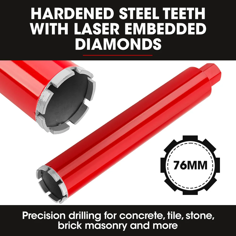 The HC-120 brings superior performance with maximum diamond bit diameter of 120mm, this machine is up for any challenge. The combo comes with a heavy-duty 76mm Diamond Core Drill Bit suitable for penetrating super tough materials, including reinforced concrete, red brick, and even granite, making it the perfect companion for a wide range of construction and repair tasks. It elevates your drilling experience to new heights. Experience effortless control and accuracy while ensuring the utmost safety and stability.